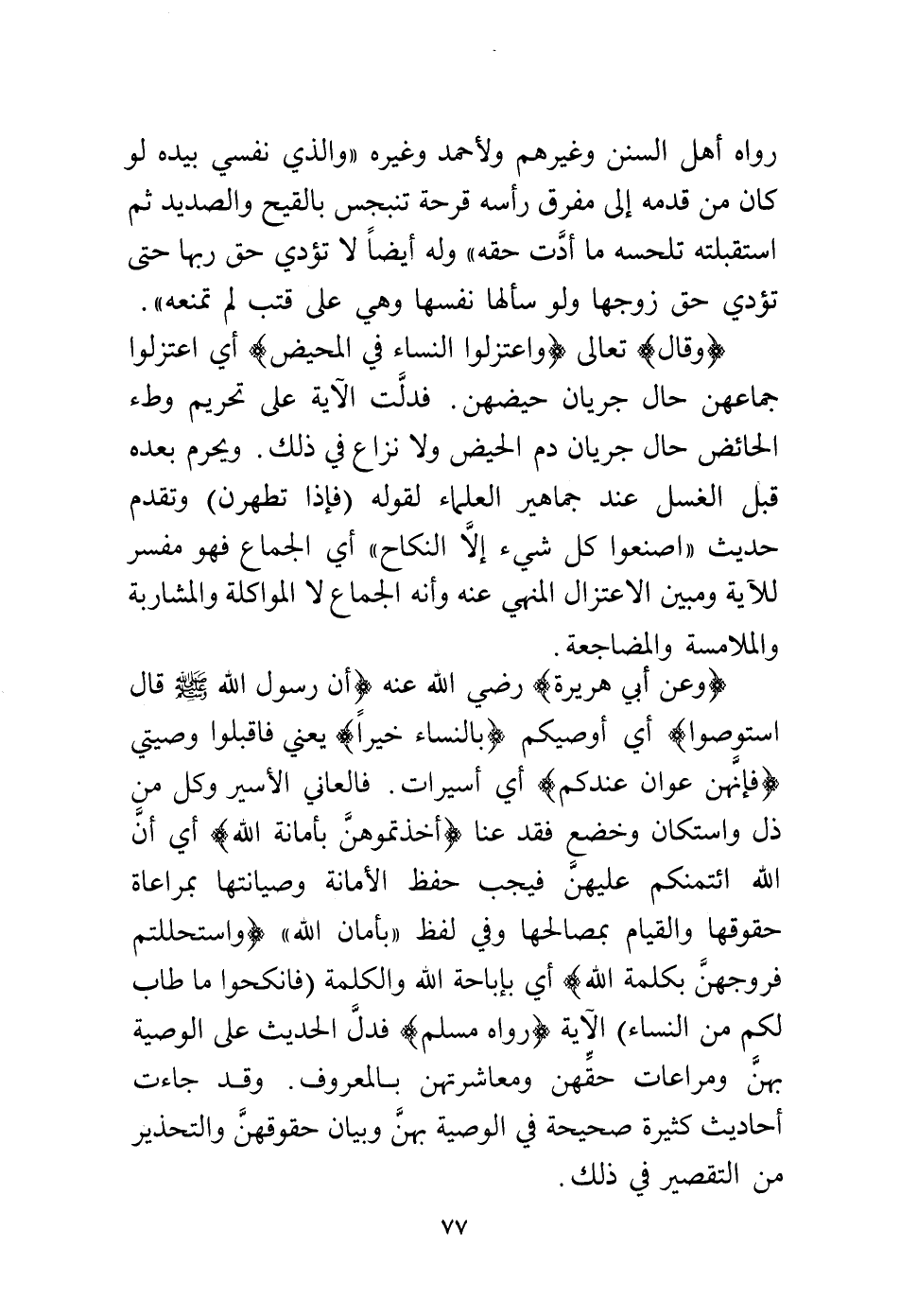 (وقال) تعالى: {فَاعْتَزِلُوا النِّسَاءَ فِي الْمَحِيضِ} أي اعتزلوا جماعهن حال جريان حيضهن، فدلت الآية على تحريم وطء الحائض حال جريان دم الحيض ولا نزاع في ذلك.