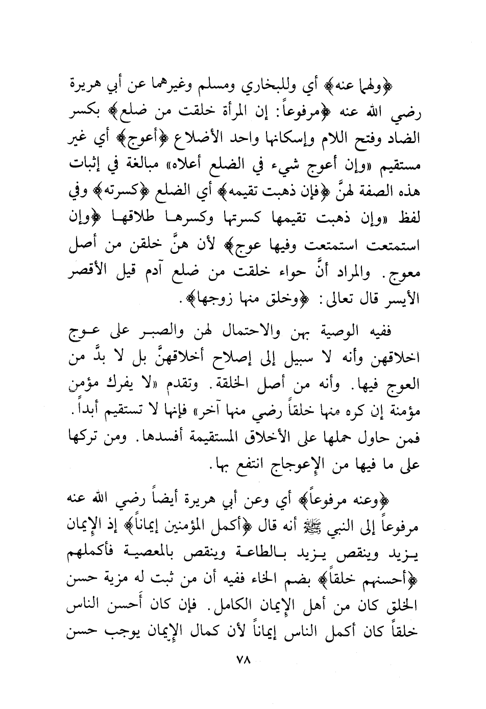 (ولهما عنه) أي وللبخاري ومسلم وغيرهما عن أبي هريرة رضي الله عنه (مرفوعًا: إن المرأة خلقت من ضلع) بكسر الضاد وفتح اللام وإسكانها واحد الأضلاع (أعوج) أي غير مستقيم "وإن أعوج شيء في الضلع أعلاه" مبالغة في إثبات هذه الصفة لهن «فإن ذهبت تقيمه» أي الضلع «كسرته» وفي لفظ «وإن ذهبت تقيمها كسرتها وكسرها طلاقها» «وإن استمتعت استمتعت بها وفيها عوج» لأنهن خلقن من أصل معوج، والمراد أن حواء خلقت من ضلع آدم قيل الأقصر الأيسر قال تعالى: {وَخَلَقَ مِنْهَا زَوْجَهَا}.