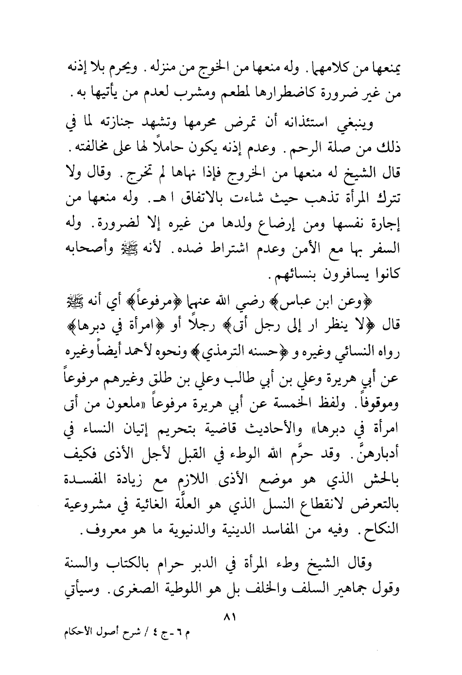 وقال الشيخ وطء المرأة في الدبر حرام بالكتاب والسنة وقول جماهير السلف والخلف بل هو اللوطية الصغرى، وسيأتي