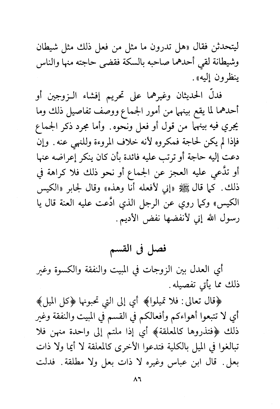 (قال تعالى: {فَلَا تَمِيلُوا} أي إلى التي تحبونها {كُلَّ الْمَيْلِ} أي لا تتبعوا أهواءكم وأفعالكم في القسم في المبيت والنفقة وغير ذلك {فَتَذَرُوهَا كَالْمُعَلَّقَةِ} أي إذا ملتم إلى واحدة منهن فلا تبالغوا في الميل بالكلية فتدعوا الأخرى كالمعلقة لا أيما ولا ذات بعل، قال ابن عباس وغيره لا ذات بعل ولا مطلقة فدلت