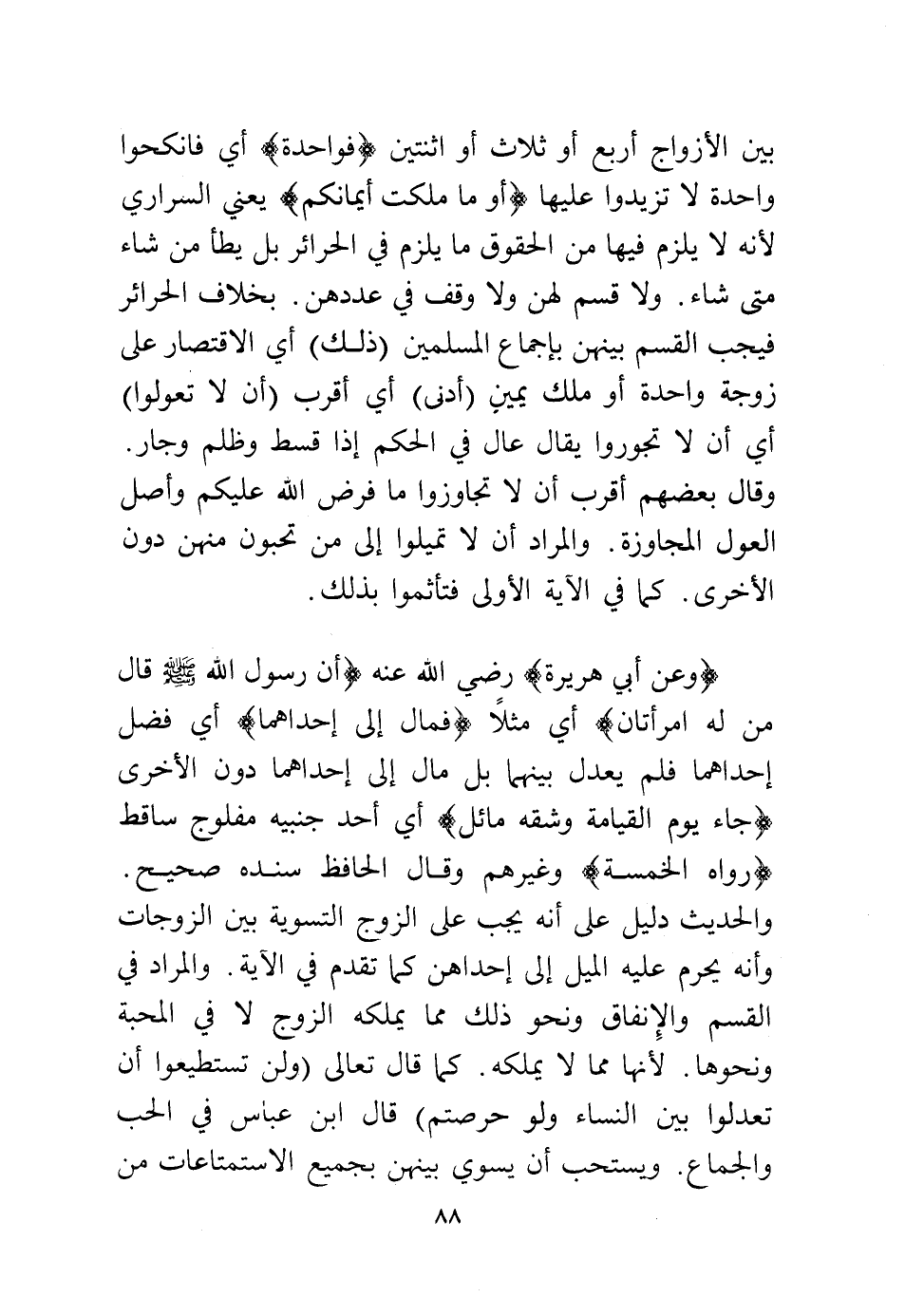 (وعن أبي هريرة) رضي الله عنه (أن رسول الله - صلى الله عليه وسلم - قال: «من له امرأتان» أي مثلا «فمال إلى إحداهما» أي فضل إحداهما فلم يعدل بينهما بل مال إلى إحداهما دون الأخرى «جاء يوم القيامة وشقه مائل» أي أحد جنبيه مفلوج ساقط (رواه الخمسة) وغيرهم، وقال الحافظ سنده صحيح، والحديث دليل على أنه يجب على الزوج التسوية بين الزوجات، وأنه يحرم عليه الميل إلى إحداهن كما تقدم في الآية. والمراد في القسم والإنفاق ونحو ذلك مما يملكه الزوج لا في المحبة ونحوها، لأنها مما لا يملكه، كما قال تعالى: {وَلَنْ تَسْتَطِيعُوا أَنْ تَعْدِلُوا بَيْنَ النِّسَاءِ وَلَوْ حَرَصْتُمْ} قال ابن عباس في الحب والجماع، ويستحب أن يسوي بينهن بجميع الاستمتاعات من