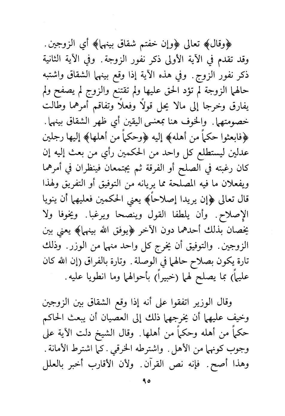 (وقال) تعالى: {وَإِنْ خِفْتُمْ شِقَاقَ بَيْنِهِمَا} أي الزوجين، وقد تقدم في الآية الأولى ذكر نفور الزوجة، وفي الآية الثانية ذكر نفور الزوج، وفي هذه الآية إذا وقع بينهما الشقاق واشتبه حالهما الزوجة لم تؤد الحق عليها ولم تقتنع والزوج لم يصفح ولم يفارق وخرجا إلى ما لا يحل قولاً وفعلاً وتفاقم أمرهما وطالت خصومتها، والخوف هنا بمعنى اليقين أي ظهر الشقاق بينهما {فَابْعَثُوا حَكَمًا مِنْ أَهْلِهِ} إليه {وَحَكَمًا مِنْ أَهْلِهَا} إليها رجلين عدلين ليستطلع كل واحد من الحكمين رأي من بعث إليه إن كان رغبته في الصلح أو الفرقة ثم يجتمعان فينظران في أمرهما ويفعلان ما فيه المصلحة مما يريانه من التوفيق أو التفريق.