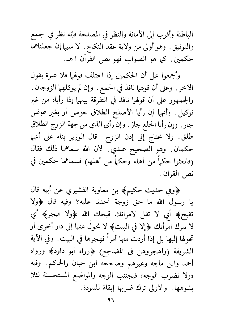 وفي الآية الشريفة {وَاهْجُرُوهُنَّ فِي الْمَضَاجِعِ} (رواه أبو داود) ورواه أحمد وابن ماجه وغيرهم وصححه ابن حبان والحاكم وفيه "ولا تضرب الوجه" فيجتنب الوجه والمواضع المستحسنة لئلا يشوها، والأولى ترك ضربها إبقاء للمودة.