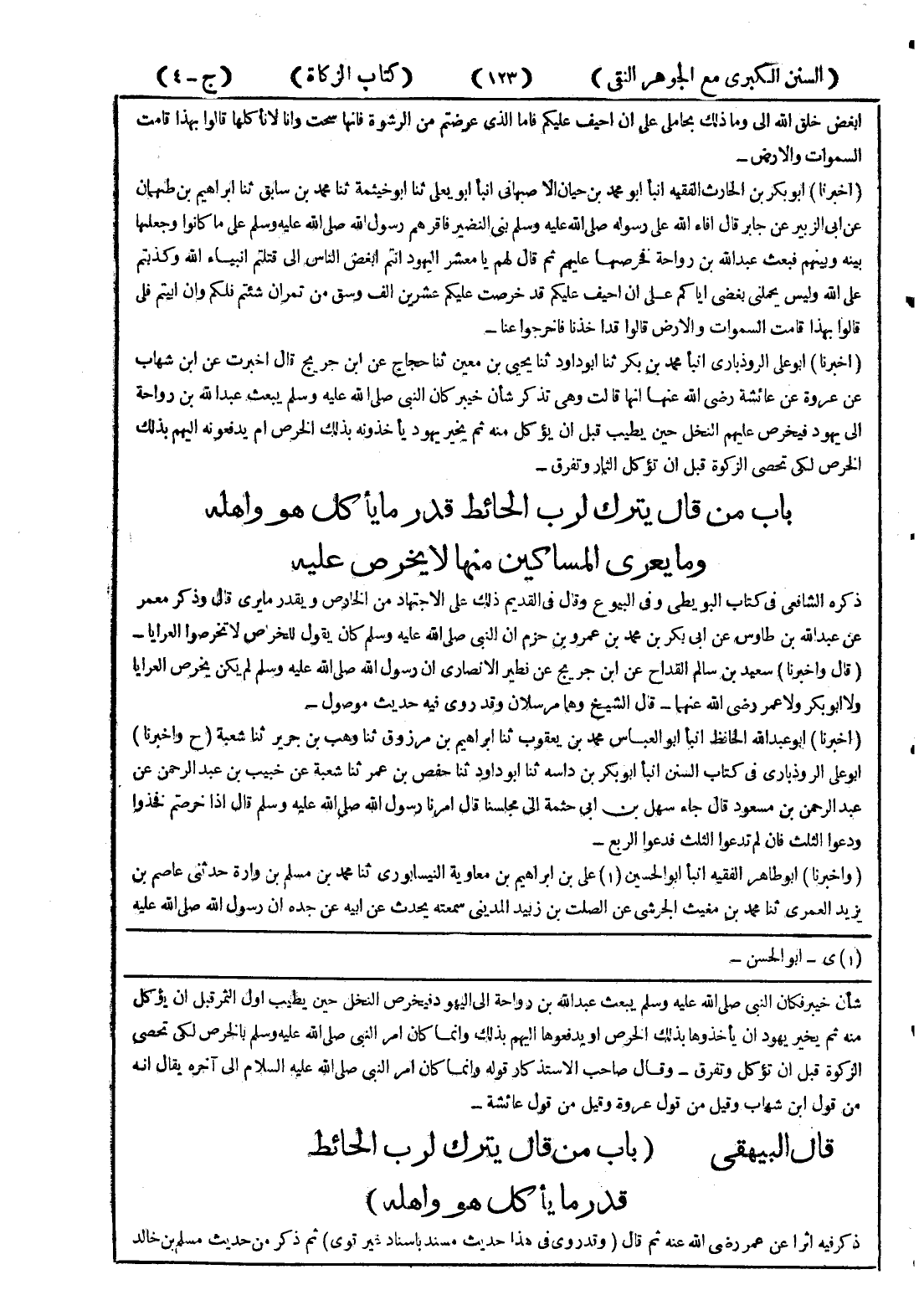 شأن خيبر فكان النبي صلى الله عليه وسلم يبعث عبد الله بن رواحة إلى اليهود فيخرص النخل حين يطيب اول الثمر قبل ان يؤكل منه ثم يخبر يهود ان يأخذوها بذلك الخرص أو يدفعوها إليهم وانما كان امر النبي صلى الله عليه وسلم بالخرص لكى تحصى الزكوة قبل ان تؤكل وتفرق - وقال صاحب الاستذكار قوله وانما كان امر النبي صلى الله عليه السلام إلى آخره يقال انه من قول ابن شهاب وقيل من قول عروة وقيل من قول عائشة - قال البيهقي (باب من قال يترك لرب الحائط قدر ما يأكل هو واهله) ذكر فيه اثرا عن عمر رضي الله عنه ثم قال (وقد روى في هذا حديث مسند باسناد غير قوي) ثم ذكر من حديث مسلم بن خالد