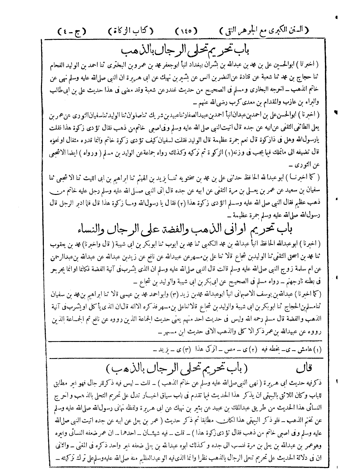 قال (باب تحريم تحلي الرجال بالذهب) ذكر فيه حديث ابي هريرة (نهى النبي صلى الله عليه وسلم عن خاتم الذهب) - قلت - ليس فيه ذكر للرجال فهو غير مطابق للباب وكان اللائق بالبيهقي ان يذكر هذا الحديث فيما تقدم في باب سياق اخبار تدل على تحريم التحلي بالذهب واخرج النسائي هذا الحديث من طريق عبد الملك بن عبيد عن بشير بن نهيك عن ابي هريرة ولفظه نهاني رسول الله صلى الله عليه وسلم عن تختم الذهب - فلو ذكر البيهقي هذا لكان مطابقا ثم ذكر حديث (عمر بن يعلي عن ابيه عن جده اتيت النبي صلى الله عليه وسلم وفي اصبعي خاتم من ذهب فقال تؤدي زكوة هذا) - قلت - فيه شيئان - احدهما - ان عمر ضعفه النسائي وغيره وهو عمر بن عبد الله بن يعلي بن مرة فنسب إلى جده وكذلك ابوه عبد الله بن يعلي ضعفه غير واحد ذكره في المغني - والثاني ان في دلالة الحديث على تحريم تحلي الرجال بالذهب نظرا وانما الذي فيه الوعيد العظيم منه صلى الله عليه وسلم على ترك تزكيته -