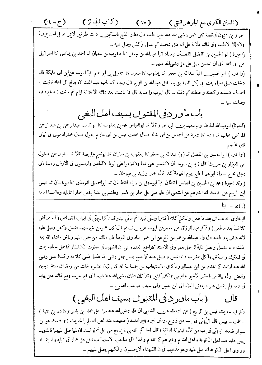 لانه عاش بعد طعنه قال وانا عبد الله بن عمر عن نافع عن ابن عمر مثله وفي الموطأ قال مالك من حمل منهم وعاش ما شاء الله بعد ذلك فانه يغسل ويصلى عليه كما عمل بعمر وفي الاستذكار اجمع العلماء على ان الشهيد في معترك الكفار إذا حمل حيا ولم يمت في المعترك وعاش واكل وشرب فانه يغسل ويصلى عليه كما صنع بعمر وعلي رضي الله عنهما انتهي كلامه وكذا علي رضي الله عنه ارتث كما تقدم عن ابن عبد البر وذكر في الاستيعاب عن جماعة انه قتل لثمان عشرة خلت من رمضان سنة اربعين وقبض اول ليلة من العشر الاخير واوصى وتكلم كثيرا وقد كان عثمان رضي الله عنه شهيدا في غير حرب ومع ذلك دفن بثيابه في دمه ولم يغسل عزاه بعض العلماء الي ابن حنبل والي سيف صاحب الفتوح - قال (باب ما ورد في المقتول بسيف اهل البغي) ذكر فيه حديث قيس بن الربيع (عن اشعث عن الشعبي عن عليا رضي الله عنه صلى على عمار بن ياسر وهاشم بن عتبة) - قلت - قيس قال البيهقي في باب من زرع ارض غيره بغير اذنه (ضعيف عند اهل العلم بالحديث) واشعث هو ابن سوار ضعفه البيهقي في باب من قال للمبتوتة النفقة وقال الحاكم الشعبي لم يسمع من علي ثم لو ثبت ان عليا صلى عليهما فالشهيد يصلي عليه عند اهل الكوفة واهل الشام وغيرهم كما تقدم ولهذا قال صاحب الاستيعاب دفن علي عمارا في ثيابه ولم يغسله ويروي اهل الكوفة انه صلى عليه وهو مذهبهم في ان الشهداء لا يغسلون ولكنهم يصلي عليهم -