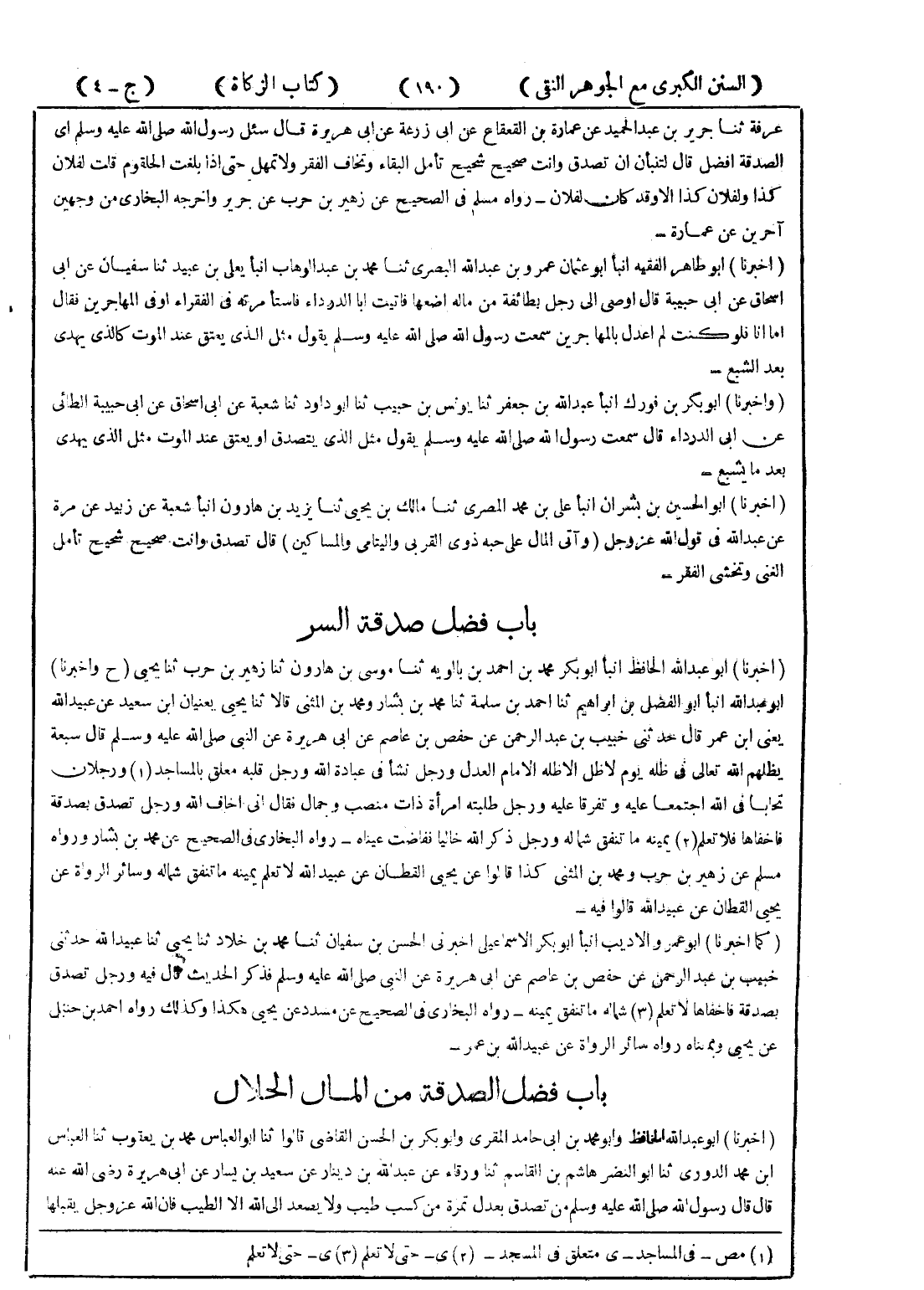 (أخبرنا) أبو عبد الله الحافظ انبأ أبو بكر محمد بن احمد بن بالوية ثنا موسى بن هارون ثنا زهير بن حرب ثنا يحيى (ح واخبرنا) أبو عبد الله انبأ أبو الفضل بن ابراهيم ثنا احمد بن سلمة ثنا محمد بن بشار ومحمد بن المثنى قالا ثنا يحيى يعنيان ابن سعيد عن عبيد الله يعني ابن عمر قال حدثني خبيب بن عبد الرحمن عن حفص بن عاصم عن ابي هريرة عن النبي صلى الله عليه وسلم قال سبعة يظلهم الله تعالى في ظلة يوم لاظل الا ظله الإمام العدل ورجل نشأ في عبادة الله ورجل قلبه معلق بالمساجد (1) ورجلان تحابا في الله اجتمعا عليه وتفرقا عليه ورجل طلبته امرأة ذات منصب وجمال فقال اني اخاف الله ورجل تصدق بصدقة فاخفاها فلاتعلم (2) يمينه ما تنفق شماله ورجل ذكر الله خاليا ففاضت عيناه - رواه البخاري في الصحيح عن محمد بن بشار ورواه مسلم عن زهير بن حرب ومحمد بن المثنى كذا قالوا عن يحيى القطان عن عبيد الله لاتعلم يمينه ما تنفق شماله وسائر الرواة عن يحيى القطان عن عبيد الله قالوا فيه - (كما اخبرنا) أبو عمرو الاديب انبأ أبو بكر الاسماعيلي اخبرني الحسن بن سفيان ثنا محمد بن خلاد ثنا يحيى ثنا عبيد الله حدثني خبيب بن عبد الرحمن عن حفص بن عاصم عن ابي هريرة عن النبي صلى الله عليه وسلم فذكر الحديث قال فيه ورجل تصدق بصدقة فاخفاها لاتعلم (3) شماله ما تنفق يمينه - رواه البخاري في الصحيح عن مسدد عن يحيى هكذا وكذلك رواه احمد بن حنبل عن يحيى وبمعناه رواه سائر الرواة عن عبيد الله بن عمر