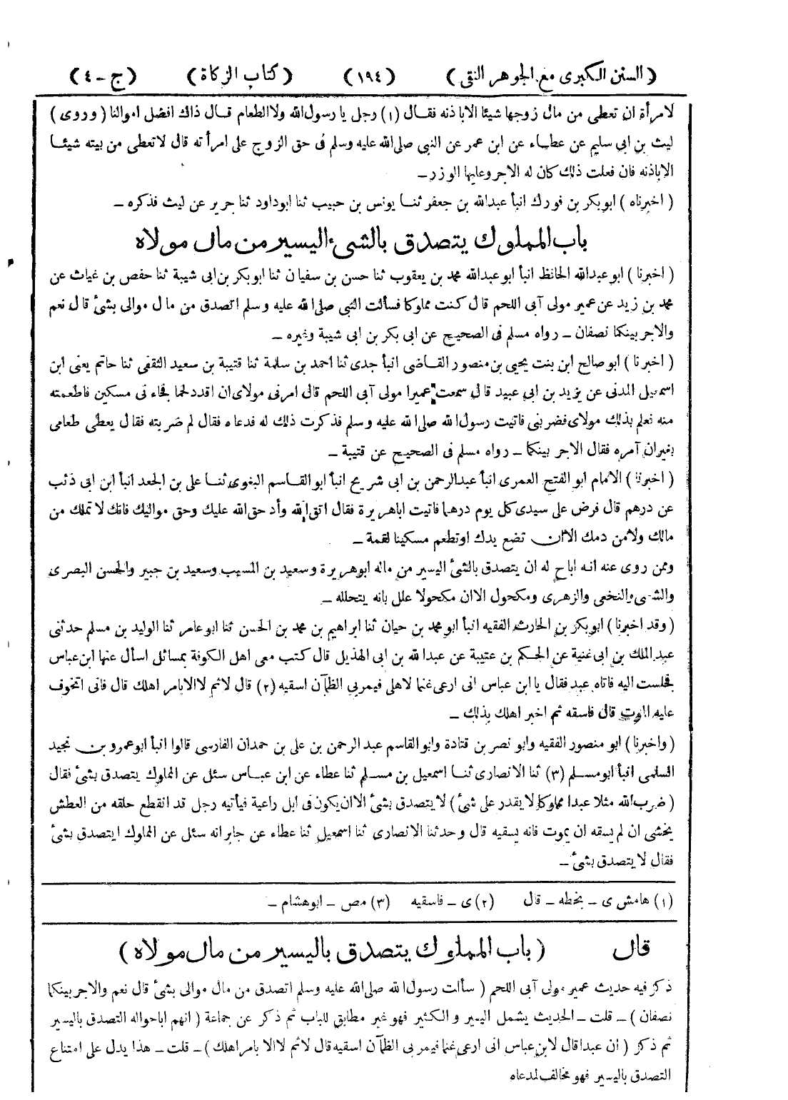 قال (باب المملوك يتصدق باليسير من مال مولاه) ذكر فيه حديث عمير مولى آبي اللحم (سألت رسول الله صلى الله عليه وسلم اتصدق من مال موالي بشئ قال نعم والاجر بينكما نصفان) - قلت - الحديث يشمل اليسير والكثير فهو غير مطابق للباب ثم ذكر عن جماعة (انهم اباحوا له التصدق باليسير ثم ذكر (ان عبدا قال لابن عباس اني ارعي غنما فيمر بي الظمآن اسقيه قال لا ثم لا الا بامر اهلك) - قلت - هذا يدل على امتناع التصدق باليسير فهو مخالف لمدعاه