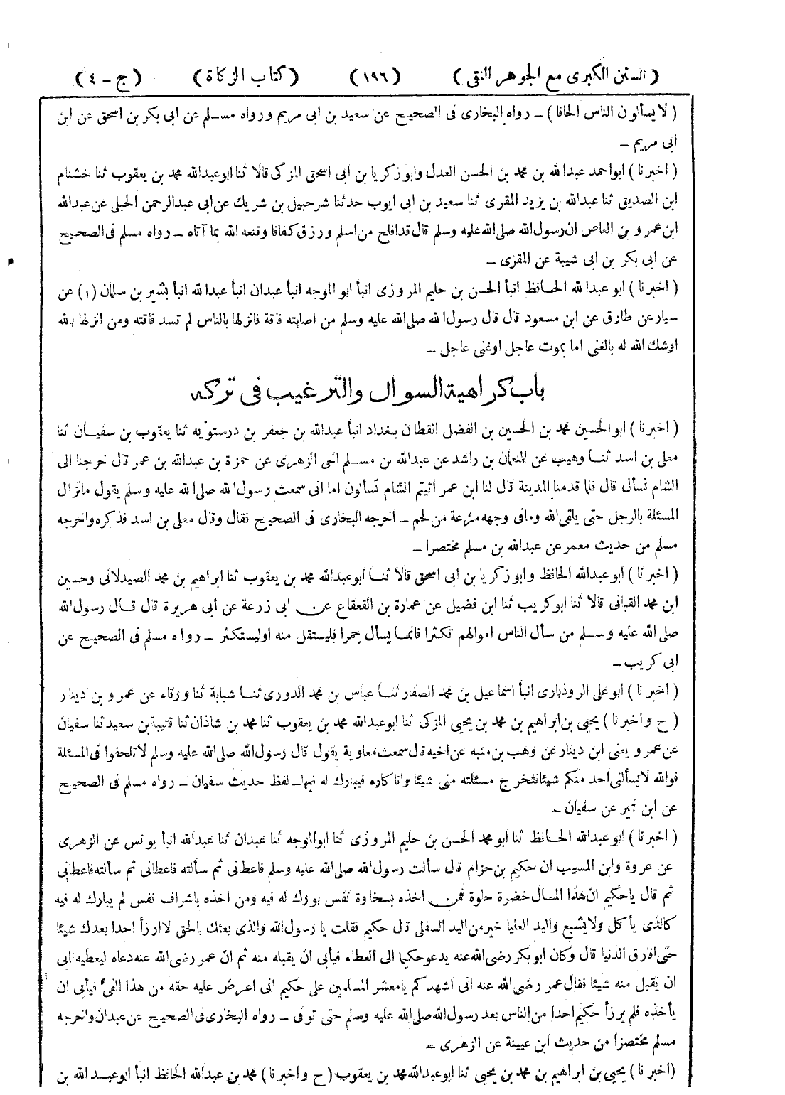 - (أخبرنا) أبو علي الروذباري انبأ اسماعيل بن محمد الصفار ثنا عباس بن محمد الدوري ثنا شبابة ثنا ورقاء عن عمرو بن دينار (ح واخبرنا) يحيى بن ابراهيم بن محمد بن يحيى المزكى ثنا أبو عبد الله محمد بن يعقوب ثنا محمد بن شاذان ثنا قتيبة بن سعيد ثنا سفيان عن عمرو يعني ابن دينار عن وهب بن منبه عن اخيه قال سمعت معاوية يقول قال رسول الله صلى الله عليه وسلم لاتلحفوا في المسألة فوالله لا يسألني احد منكم شيئا فتخرج مسئلته مني شيئا وانا كاره فيبارك له فيها - لفظ حديث سفيان - رواه مسلم في الصحيح عن ابن نمير عن سفيان