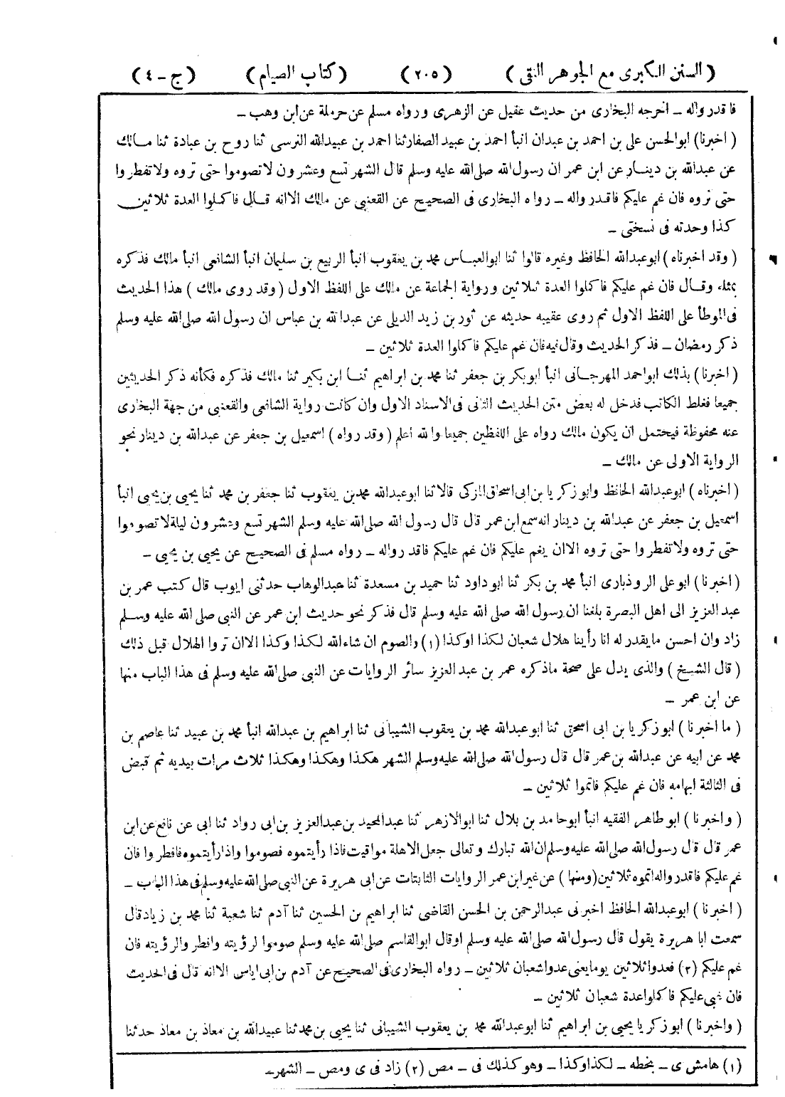 - (أخبرنا) أبو الحسن علي بن احمد بن عبدان انبأ احمد بن عبيد الصفار ثنا احمد بن عبيد الله النرسي ثنا روح بن عبادة ثنا مالك عن عبد الله بن دينار عن ابن عمر ان رسول الله صلى الله عليه وسلم قال الشهر تسع وعشرون لا تصوموا حتى تروه ولا تفطروا حتى تروه فان غم عليكم فاقدروا له - رواه البخاري في الصحيح عن القعنبي عن مالك الا انه قال فاكملوا العدة ثلاثين كذا وحدته في نسختي - (وقد اخبرناه) أبو عبد الله الحافظ وغيره قالوا ثنا أبو العباس محمد بن يعقوب انبأ الربيع بن سليمان انبأ الشافعي انبأ مالك فذكره بمثله وقال فان غم عليكم فاكملوا العدة ثلاثين ورواية الجماعة عن مالك على اللفظ الاول (وقد روى مالك) هذا الحديث
