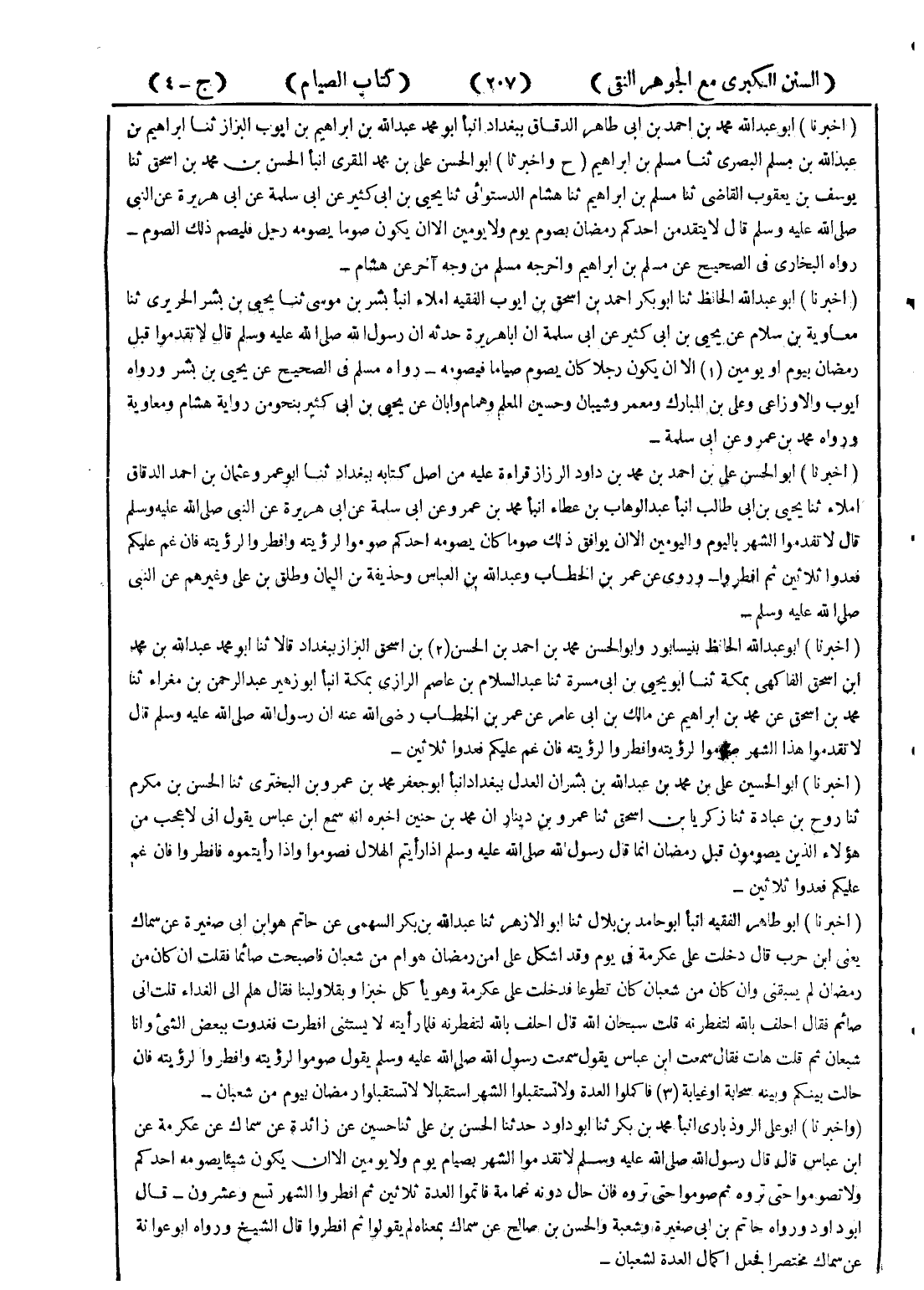 (وأخبرنا) أبو علي الروذباري انبأ محمد بن بكر ثنا أبو داود حدثنا الحسن بن علي ثنا حسين عن زائدة عن سماك عن عكرمة عن ابن عباس قال قال رسول الله صلى الله عليه وسلم لا تقدموا الشهر بصيام يوم ولا يومين الا ان يكون شيئا يصومه احدكم ولا تصوموا حتى تروه ثم صوموا حتى تروه فان حال دونه غمامة فاتموا العدة ثلاثين ثم افطروا الشهر تسع وعشرون - قال أبو داود ورواه حاتم بن ابي صغيرة وشعبة والحسن بن صالح عن سماك بمعناه لم يقولوا ثم افطروا قال الشيخ ورواه أبو عوانة عن سماك مختصرا فجعل اكمال العدة لشعبان -
