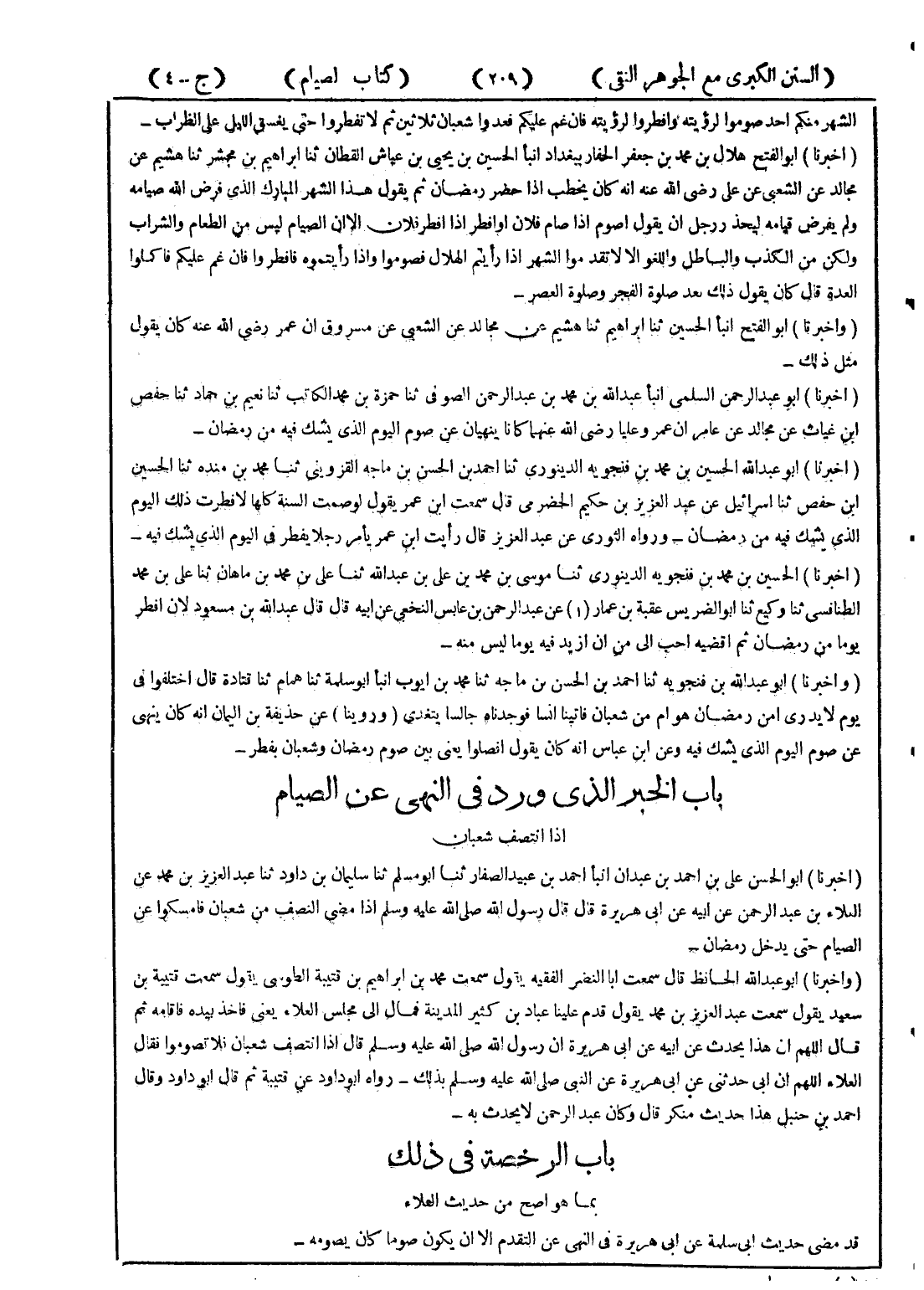 - (أخبرنا) أبو عبد الرحمن السلمى انبأ عبد الله بن محمد بن عبد الرحمن الصوفي ثنا حمزة بن محمد الكاتب ثنا نعيم بن حماد ثنا حفص ابن غياث عن مجالد عن عامر عن عمر وعليا رضي الله عنهما كانا ينهيان عن صوم اليوم الذي يشك فيه من رمضان