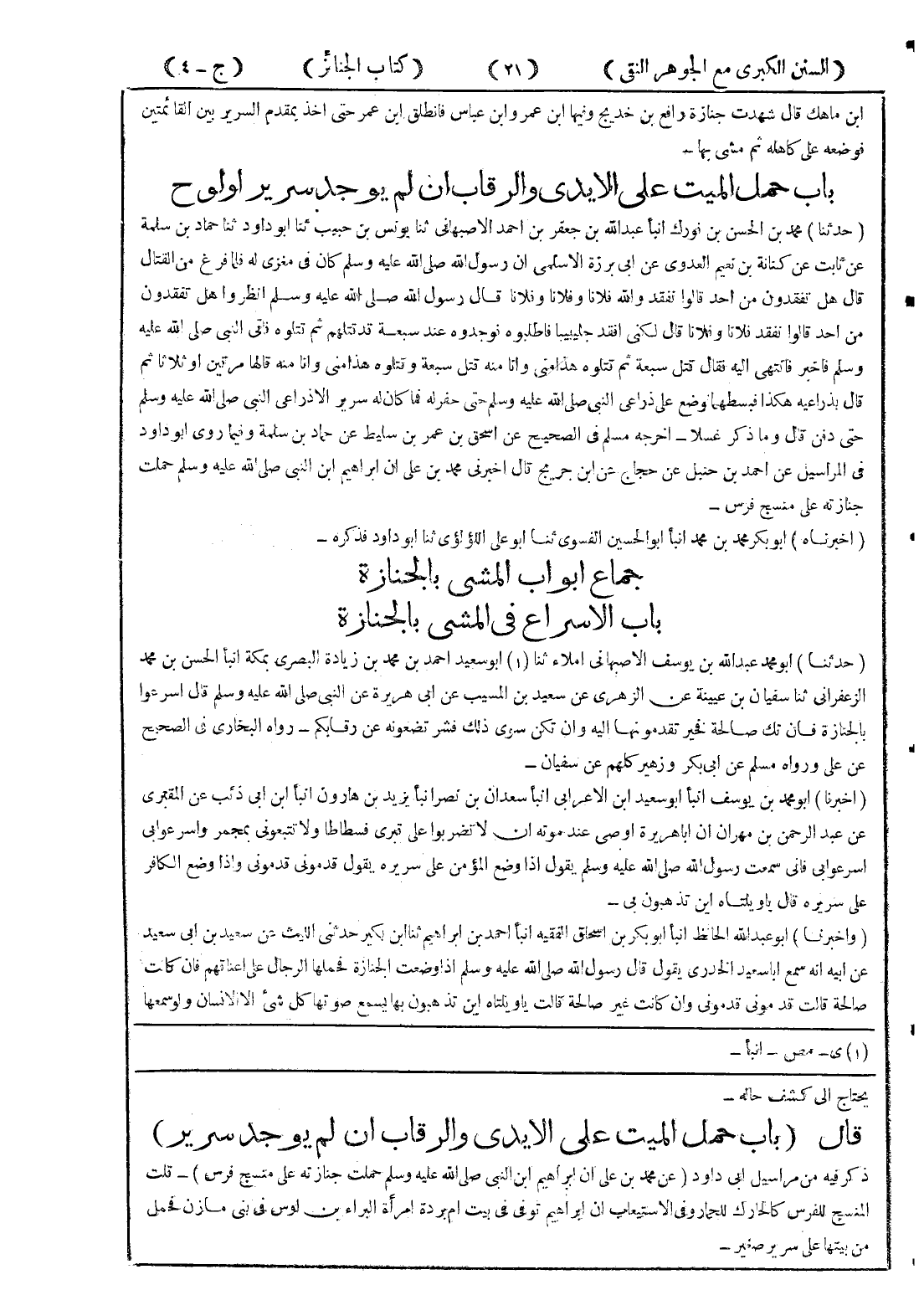 يحتاج إلى كشف حاله - قال (باب حمل الميت على الايدي والرقاب ان لم يوجد سرير) ذكر فيه من مراسيل ابي داود (عن محمد بن علي ان ابراهيم ابن النبي صلى الله عليه وسلم حملت جنازته على منسج فرس) - قلت المنسج للفرس كالحارك للحمار وفي الاستيعاب ان ابراهيم توفي في بيت ام بردة امرأة البراء بن اوس في بني مازن فحمل من بيتها على سرير صغير