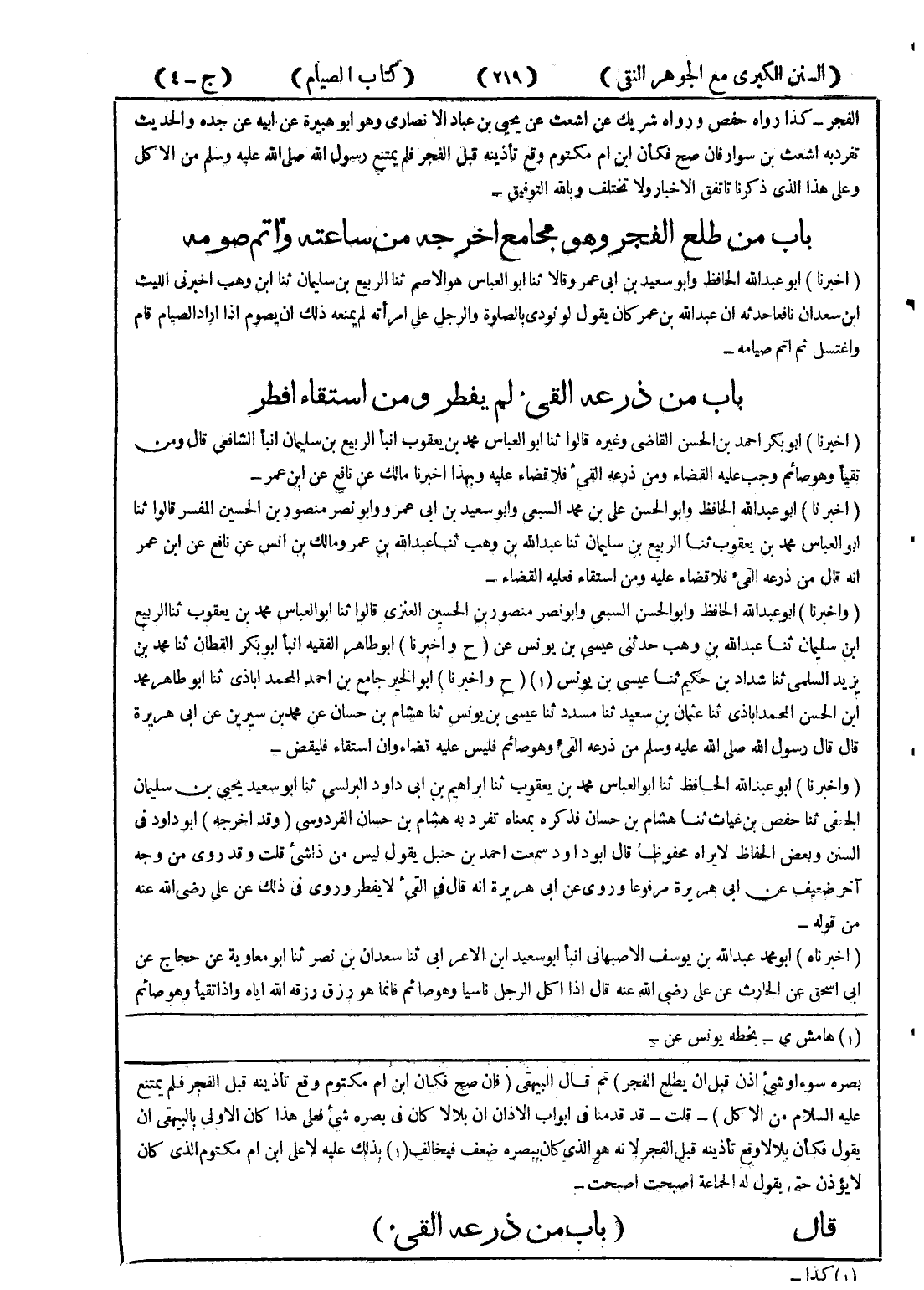 بصره سوء أو شئ اذن قبل ان يطلع الفجر) ثم قال البيهقي (فان صح فكان ابن ام مكتوم وقع تأذينه قبل الفجر فلم يمتنع عليه السلام من الاكل) - قلت - قد قدمنا في ابواب الاذان ان بلالا كان في بصره شئ فعلى هذا كان الاولى بالبيهقي ان يقول فكأن بلالا وقع تأذينه قبل الفجر لانه هو الذي كان ببصره ضعف فيخالف (1) بذلك عليه لا على ابن ام مكتوم الذي كان لا يؤذن حتى يقول له الجماعة اصبحت اصبحت - قال (باب من ذرعه القئ)