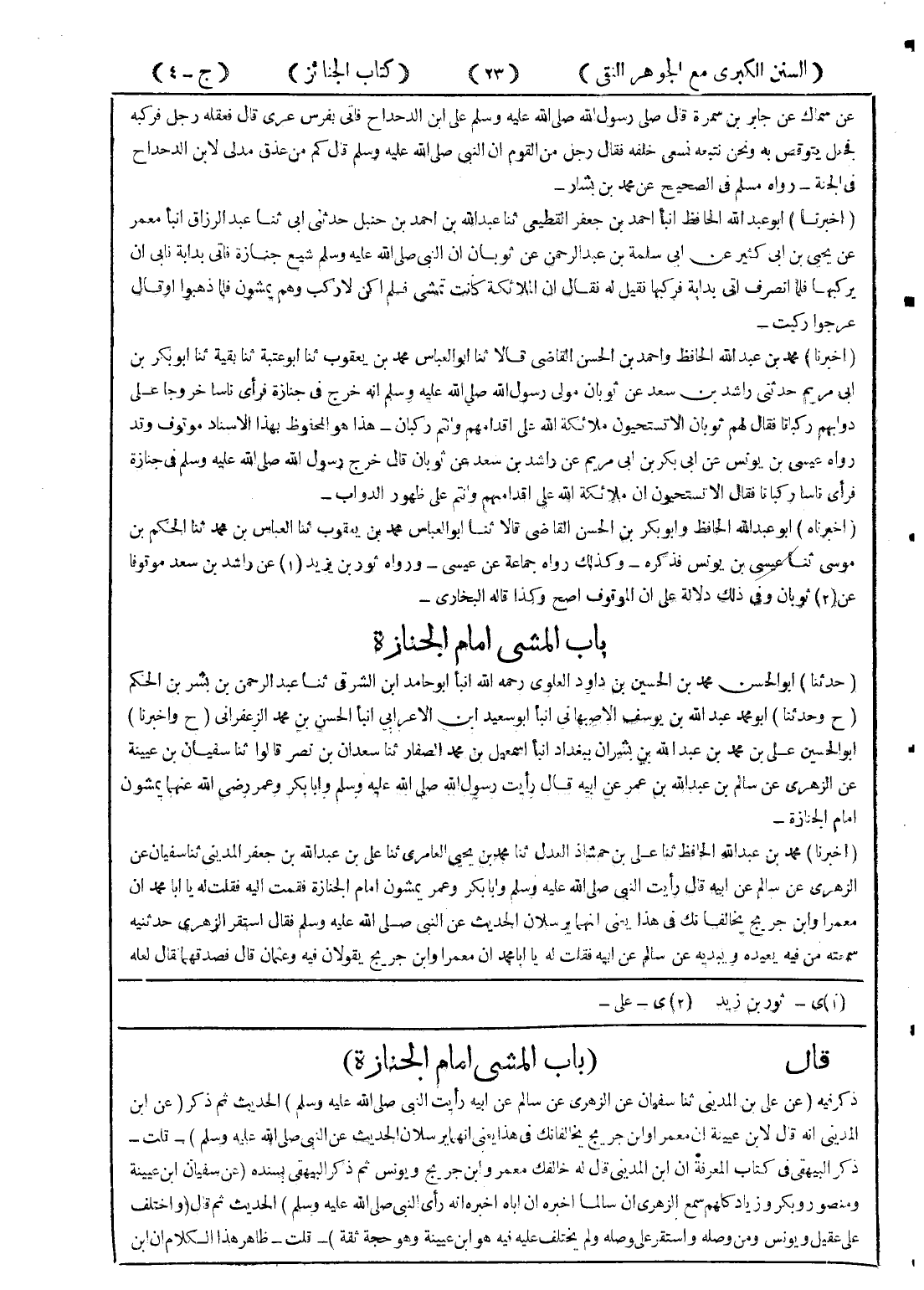 قال (باب المشي امام الجنازة) ذكر فيه (عن علي بن المديني ثنا سفيان عن الزهري عن سالم عن ابيه رأيت النبي صلي الله عليه وسلم) الحديث ثم ذكر (عن ابن المديني انه قال لابن عيينة ان معمرا وابن جريح يخالفانك في هذا يعني انهما يرسلان الحديث عن النبي صلى الله عليه وسلم) - قلت - ذكر البيهقي في كتاب المعرفة ان ابن المديني قال له خالفك معمر وابن جريح ويونس ثم ذكر البيهقي بسنده (عن سفيان ابن عيينة ومنصور وبكر وزياد كلهم سمع الزهري ان سالما اخبره انه رأى النبي صلى الله عليه وسلم) الحديث ثم قال (واختلف علي عقيل ويونس ومن وصله واستقر على وصله ولم يختلف عليه فيه هو ابن عيينة وهو حجة ثقة) - قلت - ظاهر هذا الكلام ان ابن