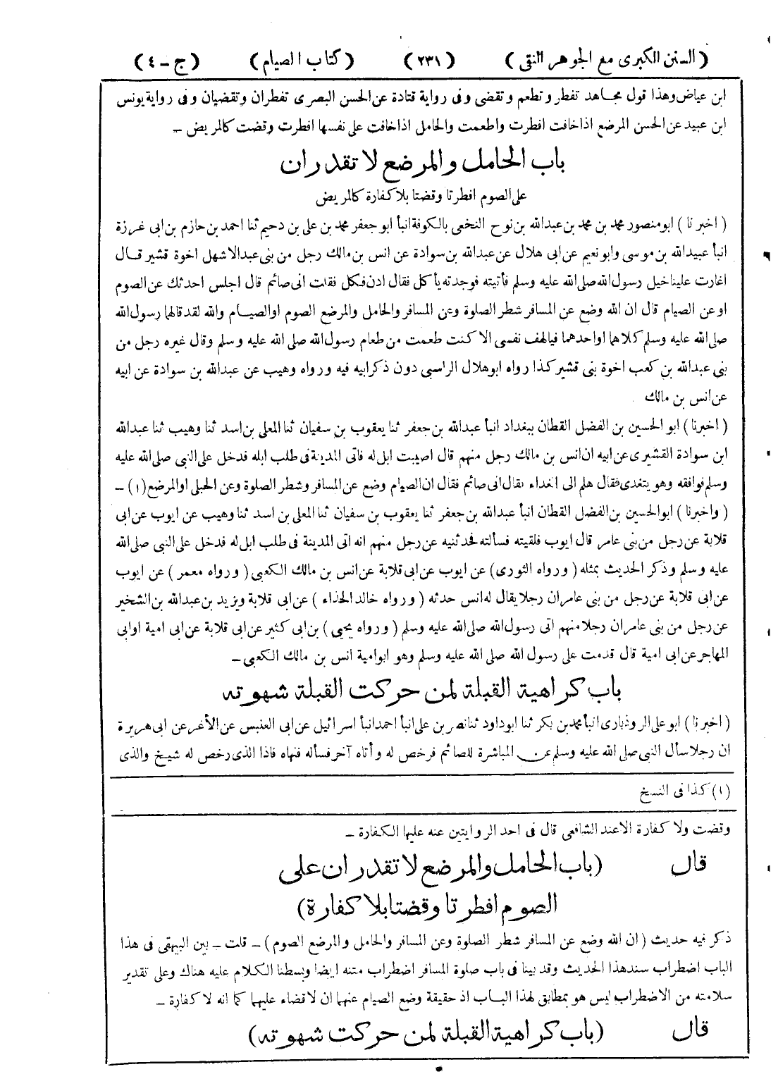 وقضت ولا كفارة الا عند الشافعي قال في احد الروايتين عنه عليها الكفارة - قال (باب الحامل والمرضع لا تقدر ان على الصوم افطرتا وقضتا بلا كفارة) ذكر فيه حديث (ان الله وضع عن المسافر شطر الصلوة وعن المسافر والحامل والمرضع الصوم) - قلت - بين البيهقي في هذا الباب اضطراب سند هذا الحديث وقد بينا في باب صلوة المسافر اضطراب متنه ايضا وبسطنا الكلام عليه هناك وعلى تقدير سلامته من الاضطراب ليس هو بمطابق لهذا الباب إذ حقيقة وضع الصيام عنهما ان لا قضاء عليهما كما انه لا كفارة - قال (باب كراهية القبلة لمن حركت شهوته)