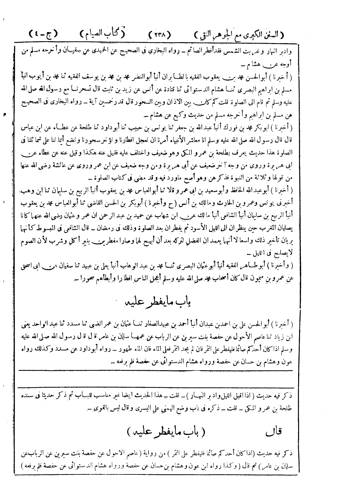 ذكر فيه حديث (إذا اقبل الليل وادبر النهار) - قلت - هذا الحديث ايضا غير مناسب للباب ثم ذكر حديثا في سنده طلحة بن عمرو المكي - قلت - ذكره في باب وضع اليمنى على اليسرى وقال ليس بالقوي - قال (باب ما يفطر عليه) ذكر فيه حديث (إذا كان أحدكم صائما فليفطر على التمر) من رواية (عاصم الاحول عن حفصة بنت سيرين عن الرباب عن سلمان بن عامر) ثم قال (وكذا رواه ابن عون وهشام بن حسان عن حفصة ورواه هشام الدستوائي عن حفصة فلم يرفعه)