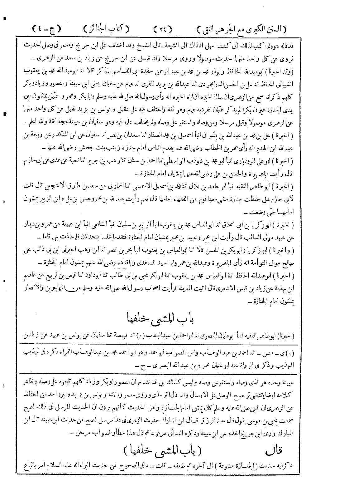 عيينة وحدة هو الذي وصله واستقر على وصله وليس كذلك بل قد تقدم ان منصورا وبكرا وزيادا كلهم تابعوه علي وصله وظاهر كلامه ايضا يقتضي ترجيح الوصل على الارسال وقد قال الترمذي وروي معمر ومالك ويونس بن يزيد وغير واحد من الحفاظ عن الزهري ان النبي صلى الله عليه وسلم كان يمشي امام الجنازة واهل الحديث كأنهم يرون ان الحديث المرسل في ذلك اصح سمعت يحيي ين موسى يقول قال عبد الرزاق قال ابن المبارك حديث الزهري في هذا مرسل اصح من حديث ابن عيينة قال ابن المبارك وارى ابن جريح اخذه عن ابن عيينة وذكره النسائي مرفوعا ثم قال هذا خطأ والصواب مرسل - قال (باب المشي خلفها) ذكر فيه حديث (الجنازه متبوعة) إلى آخره ثم ضعفه - قلت - ما في الصحيح من حديث البراء انه عليه السلام امر باتباع