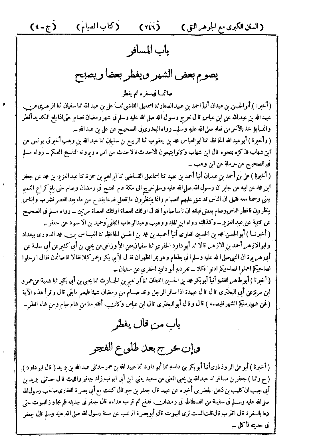 (أخبرنا) أبو الحسن بن عبدان أنبأ احمد بن عبيد الصفار ثنا اسمعيل القاضي ثنا علي بن عبد الله ثنا سفيان ثنا الزهري عن عبيد الله بن عبد الله عن ابن عباس قال خرج رسول الله صلى الله عليه وسلم في شهر رمضان فصام حتى إذا بلغ الكديد أفطر وانما يؤخذ بالآخر من فعله صلى الله عليه وسلم - رواه البخاري في الصحيح عن علي بن عبد الله