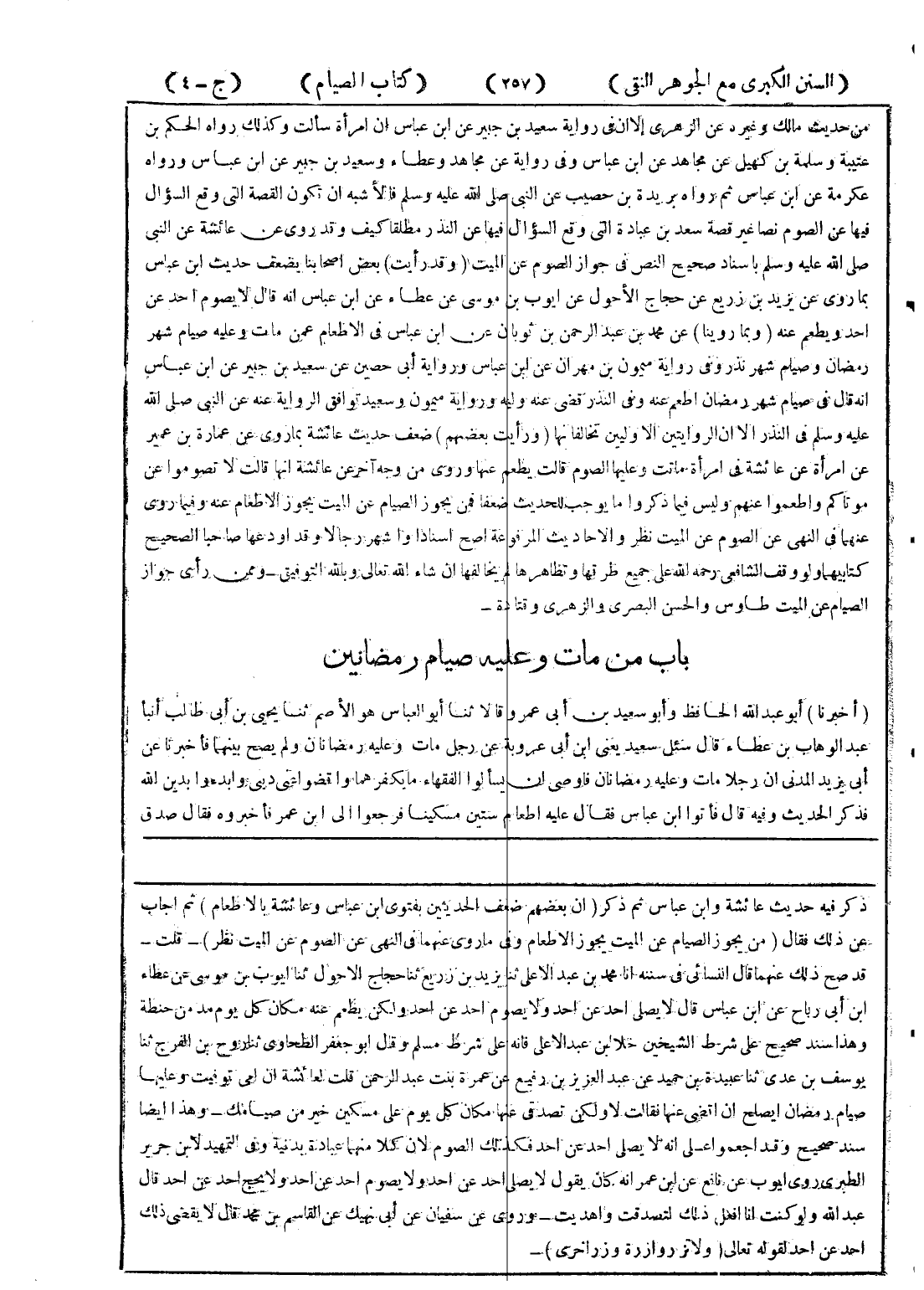 ذكر فيه حديث عائشة وابن عباس ثم ذكر (ان بعضهم ضعف الحديثين بفتوى ابن عباس وعائشة بالاطعام) ثم اجاب عن ذلك فقال (من يجوز الصيام عن الميت يجوز الاطعام وفي ما روى عنهما في النهى عن الصوم عن الميت نظر) - قلت - قد صح ذلك عنهما قال النسائي في سننه انا محمد بن عبد الاعلى ثنا يزيد بن زريع ثنا حجاج الاحول ثنا ايوب بن موسى عن عطاء ابن أبي رباح عن ابن عباس قال لا يصلي احد عن احد ولا يصوم احد عن احد ولكن يطعم عنه مكان كل يوم مد من حنطة وهذا سند صحيح على شرط الشيخين خلا ابن عبد الاعلى فانه على شرط مسلم وقال أبو جعفر الطحاوي ثنا روح بن الفرج ثنا يوسف بن عدي ثنا عبيدة بن حميد عن عبد العزيز بن رفيع عن عمرة بنت عبد الرحمن قلت لعائشة ان امي توفيت وعليها صيام رمضان ايصلح ان اقضي عنها فقالت لا ولكن تصدقي عنها مكان كل يوم على مسكين خير من صيامك - وهذا ايضا سند صحيح وقد اجمعوا على انه لا يصلى احد عن احد فكذلك الصوم لان كلا منهما عبادة بدنية وفي التمهيد لابن جرير الطبري روى ايوب عن نافع عن ابن عمر انه كان يقول لا يصلي احد عن احد ولا يصوم احد عن احد ولا يحج احد عن احد قال عبد الله ولو كنت انا افعل ذلك لتصدقت واهديت - وروى عن سفيان عن أبي نهيك عن القاسم بن محمد قال لا يقضي ذلك احد عن احد لقوله تعالى (ولا تزر وازرة وزر اخرى