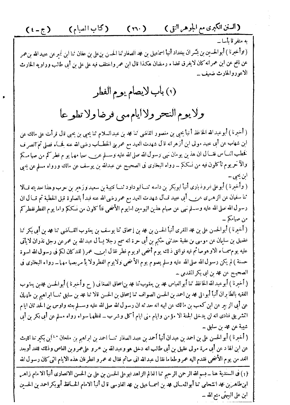 - (أخبرنا) أبو الحسن علي بن محمد المقري أنبأ الحسن بن محمد بن إسحاق ثنا يوسف بن يعقوب القاضي ثنا محمد بن أبي بكر ثنا فضيل بن سليمان عن موسى بن عقبة حدثني حكيم بن أبي حرة انه سمع رجلا يسأل عبد الله بن عمر عن رجل نذران لا يأتي عليه يوم سماه الا وهو صائم فيه فوافق ذلك يوم أضحى أو يوم فطر فقال ابن عمر (لقد كان لكم في رسول الله اسوة حسنة) لم يكن رسول الله صلى الله عليه وسلم يصوم يوم الاضحى ولا يوم الفطر ولا يأمر بصيامهما - رواه البخاري في الصحيح عن محمد بن ابي بكر المقدمي