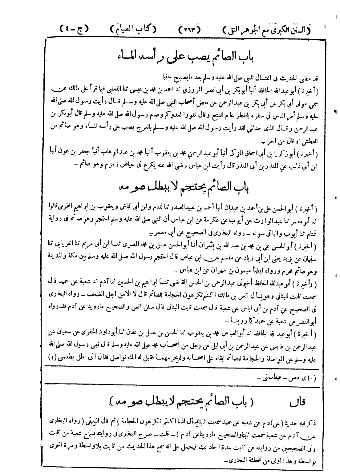 قال (باب الصائم يحتجم لا يبطل صومه) ذكر فيه حديثا (عن آدم عن شعبة عن حميد سمعت ثابتا يسأل انسا اكنتم تكرهون الحجامة) ثم قال البيهقي (رواه البخاري عن آدم عن شعبة سمعت ثابتا والصحيح ما روينا عن آدم) - قلت - صرح البخاري في روايته بسماع شعبة من ثابت وفي الصحيحين من روايته عن ثابت عدة احاديث فيحمل على انه سمع هذا الحديث من ثابت بلا واسطة ومرة اخرى بواسطة وهذا اولى من تخطئة البخاري -