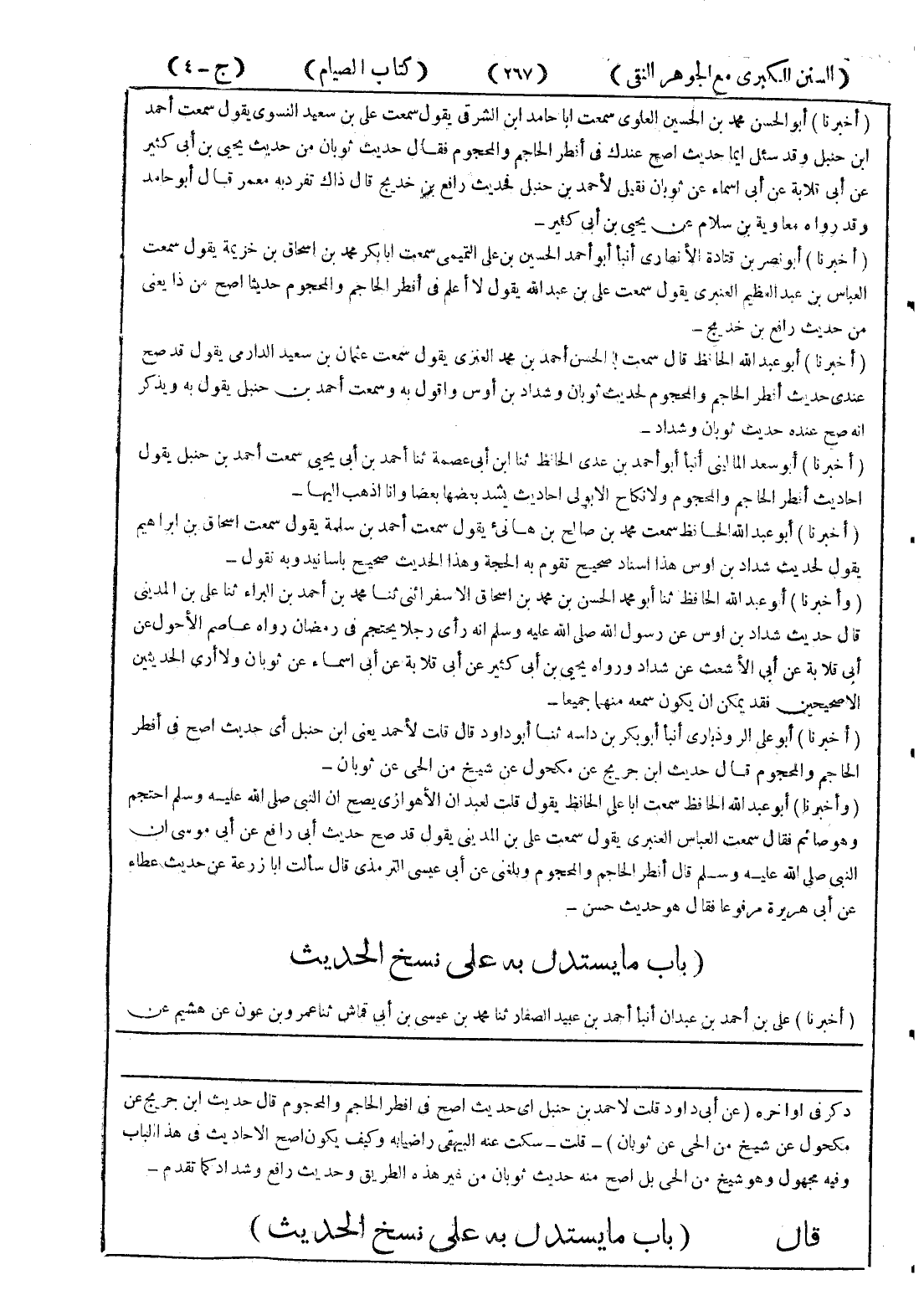ذكر في اواخره (عن أبي داود قلت لاحمد بن حنبل اي حديث اصح في افطر الحاجم والمحجوم قال حديث ابن جريج عن مكحول عن شيخ من الحي عن ثوبان) - قلت - سكت عنه البيهقي راضيا به وكيف يكون اصح الاحاديث في هذا الباب وفيه مجهول وهو شيخ من الحي بل اصح منه حديث ثوبان من غير هذه الطريق وحديث رافع وشداد كما تقدم - قال (باب ما يستدل به على نسخ الحديث)