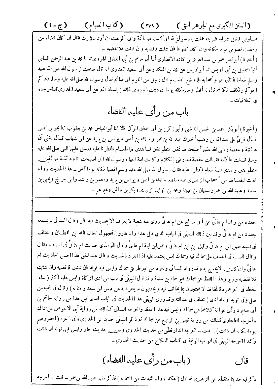 جعدة من ولد ام هانئ عن أبي صالح عن ام هانئ روى عنه شعبة لا يعرف الا بحديث فيه نظر وقال النسائي لم يسمعه جعدة من ام هانئ وقد بين ذلك البيهقي في الباب الذي قبل هذا واما هارون فمجهول الحال قاله ابن القطان واختلف في نسبته فقيل ابن ام هانئ وقيل ابن ابن ام هانئ وقيل ابن ابنة ام هانئ وقال الترمذي حديث ام هانئ في اسناده مقال وقال النسائي اختلف على سماك فيه وسماك ليس يعتمد عليه إذا انفرد بالحديث وقال عبد الحق هذا احسن احاديث ام هانئ وان كان لا يحتج به وقد رواه النسائي وغيره من غير طريق سماك وليس فيه قوله فان شئت فاقضيه وان شئت فلا تقضيه ولم يرو هذا اللفظ عن سماك غير حماد بن سلمة وقد قال البيهقي في باب من ادى الزكاة وليس عليه اكثر (ساء حفظه في آخر عمره فالحفاظ لا يحتجون بما يخالف فيه ويجتنبون ما ينفرد به عن قيس ابن سعد وامثاله) وقال في باب من صلى وفي ثوبه أو نعله اذى (مختلف في عدالته وقد روى البيهقي هذا الحديث في الباب الذي قبل هذا من رواية حاتم بن أبي صغيرة وأبي عوانة كلاهما عن سماك وليس فيه هذا اللفظ واخرجه النسائي كذلك من رواية أبي الاحوص عن سماك وأخرجه الطحاوي كذلك من رواية قيس بن الربيع عن سماك ثم ذكر البيهقي حديثا عن الخدري وفي آخره (افطر وصم يوما مكانه ان شئت) - قلت - اخرجه الدارقطني من حديث الخدري ومن حديث جابر وليس فيهما قوله ان شئت وكذا اخرجه البيهقي في ابواب الوليمة في كتاب النكاح من حديث الخدري - قال (باب من رأى عليه القضاء) ذكر فيه حديثا منقطعا عن الزهري ثم قال (هكذا رواه الثقات من اصحابه) فذكر منهم عبيد الله بن عمر - قلت - اخرجه