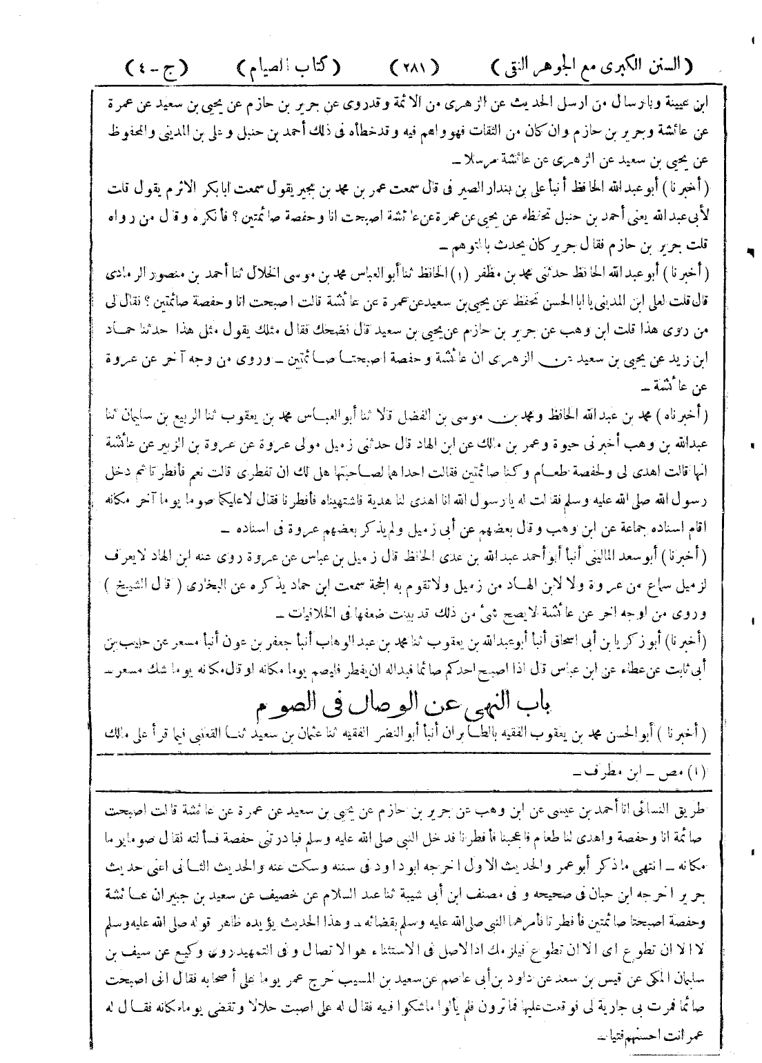 طريق النسائي انا أحمد بن عيسى عن ابن وهب عن جرير بن حازم عن يحيى بن سعيد عن عمرة عن عائشة قالت اصبحت صائمة انا وحفصة واهدي لنا طعام فاعجبنا فأفطرنا فدخل النبي صلى الله عليه وسلم فبادرتني حفصة فسألته فقال صوما يوما مكانه - انتهى ما ذكر أبو عمر والحديث الاول اخرجه أبو داود في سننه وسكت عنه والحديث الثاني اعني حديث جرير اخرجه ابن حبان في صحيحه وفي مصنف ابن أبي شيبة ثنا عبد السلام عن خصيف عن سعيد بن جبير ان عائشة وحفصة اصبحتا صائمتين فأفطرتا فأمرهما النبي صلى الله عليه وسلم بقضائه - وهذا الحديث يؤيده ظاهر قوله صلى الله عليه وسلم لا الا ان تطوع اي الا ان تطوع فيلزمك إذ الاصل في الاستثناء هو الاتصال وفي التمهيد روى وكيع عن يوسف بن سلبمان المكي عن قيس بن سعد عن داود بن أبي عاصم عن سعيد بن المسيب خرج عمر يوما علي أصحابه فقال اني اصبحت صائما فمرت بي جارية لي فوقعت عليها فما ترون فلم يألوا ما شكوا فيه فقال له على اصبت حلالا وتقضي يوما مكانه فقال له عمر انت احسنهم فتيا -