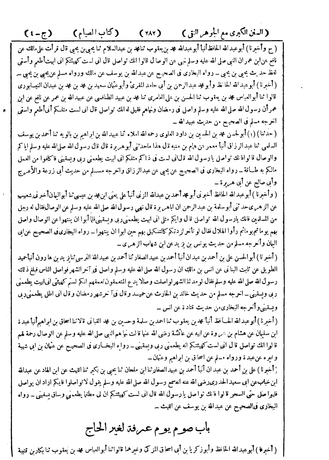 - (أخبرنا) أبو عبد الله الحافظ وأبو محمد عبد الرحمن بن أبى حامد المقرئ وأبو عثمان سعيد بن محمد بن محمد بن عبدان النيسابوري قالواثنا أبو العباس محمد بن يعقوب ثنا الحسن بن على العامري ثنا محمد بن عبيد الطنافسى عن عبيدالله بن عمر عن نافع عن ابن عمر أن رسول الله صلى الله عليه وسلم واصل في رمضان ونهاهم فقيل له انك تواصل قال انى لست مثلكم أنى أطعم واسقي اخرجه مسلم في الصحيح من حديث عبيدالله -
