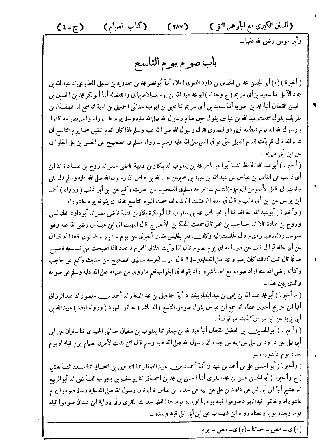 - (وأخبرنا) أبو عبد الله الحافظ ثنا أبو العباس محمد بن يعقوب ثنا أبو بكرة بكاربن قتيبة قاضى مصرثنا أبو داود الطيالسي وروح بن عبادة قالا ثنا حاجب بن عمر قال سمعت الحكم بن الاعرج قال انتهيت إلى ابن عباس رضى الله عنه وهو متوسد رداءه عند زمزم قال فجلست إليه وكان نعم الجليس فقلت أخبرني عن يوم عاشوراء فاستوى قاعدا ثم قال عن أي حاله تسأل قلت عن صيامه أي يوم نصوم قال إذا رأيت هلال المحرم فاعدد فإذا اصبحت من تاسعه فاصبح صائما قال قلت كذلك كان يصوم محمد صلى الله عليه وسلم؟ قال نعم - اخرجه مسلم في الصحيح من حديث وكيع عن حاجب وكأنه رضى الله عنه اراد صومه مع العاشر واراد بقوله في الجواب نعم ماروى من عزمه صلى الله عليه وسلم على صومه والذى يبين هذا -