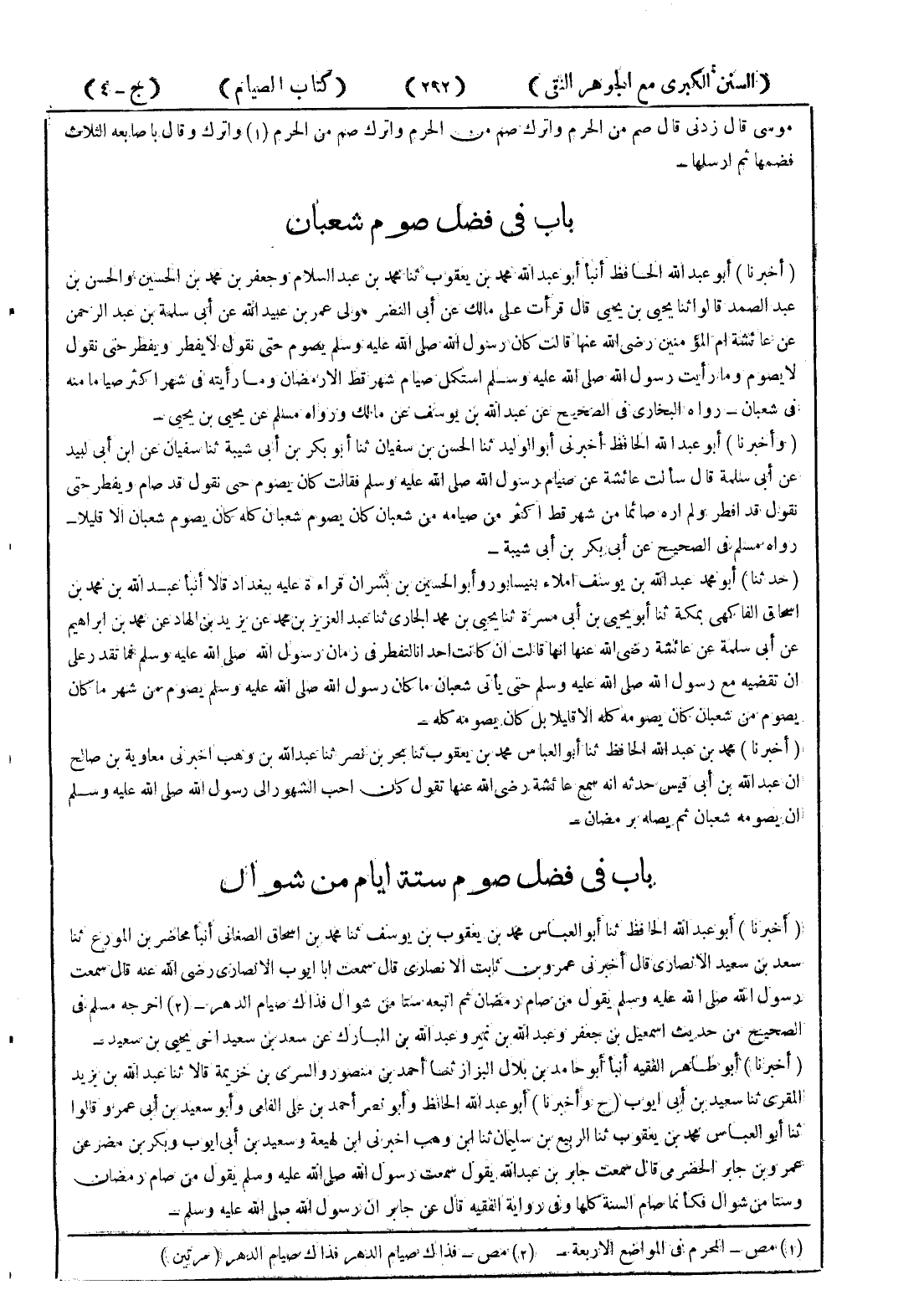 - (أخبرنا) محمد بن عبد الله الحافظ ثنا أبو العباس محمد بن يعقوب ثنا بحر بن نصر ثنا عبد الله بن وهب اخبرني معاوية بن صالح ان عبد الله بن أبى قيس حدثه انه سمع عائشة رضى الله عنها تقول كان احب الشهور إلى رسول الله صلى الله عليه وسلم ان يصومه شعبان ثم يصله برمضان