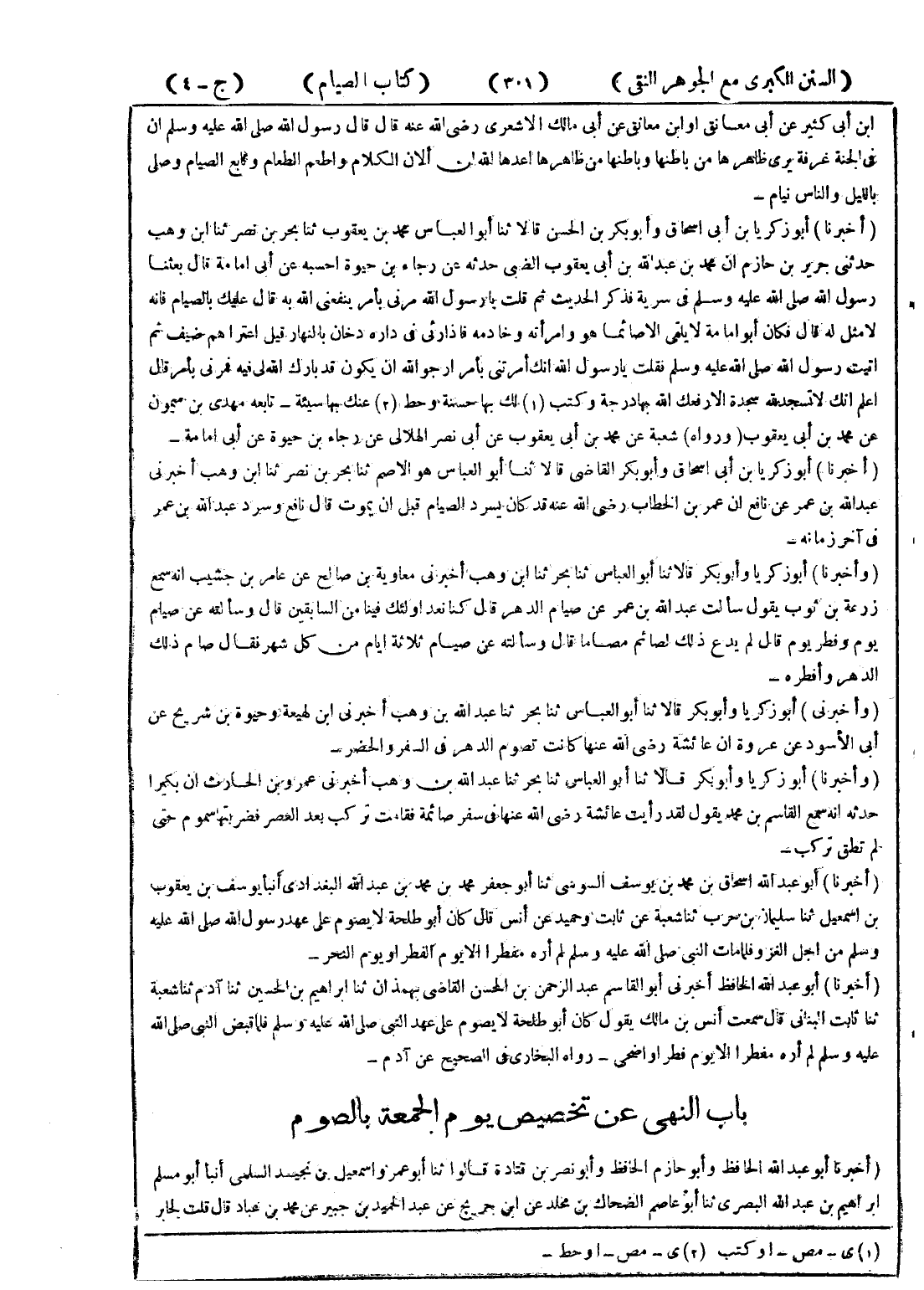 - باب النهى عن تخصيص يوم الجمعة بالصوم (أخبرنا أبو عبد الله الحافظ وأبو حازم الحافظ وأبو نصر بن قتادة قالوا ثنا أبو عمرو اسمعيل بن نجيد السلمى أنبأ أبو مسلم ابراهيم بن عبد الله البصري ثنا أبو عاصم الضحاك بن مخلد عن ابن جريج عن عبد الحميد بن جبير عن محمد بن عباد قال قلت لجابر