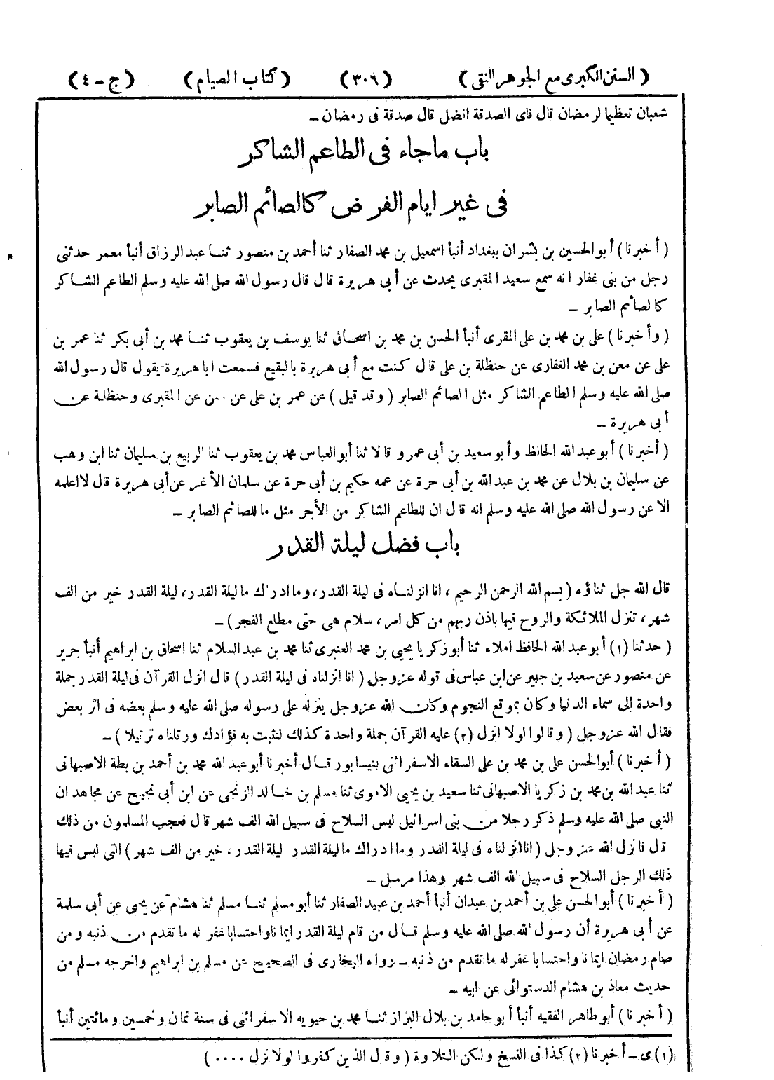 - (أخبرنا) أبو عبد الله الحافظ وأبو سعيد بن أبى عمروقالا ثنا أبو العباس محمد بن يعقوب ثنا الربيع بن سليمان ثنا ابن وهب عن سليمان بن بلال عن محمد بن عبد الله بن أبى حرة عن عمه حكيم بن أبى حرة عن سلمان الاغر عن أبى هريرة قال لااعلمه الاعن رسول الله صلى الله عليه وسلم انه قال ان للطاعم الشاكر من الاجر مثل ما للصائم الصابر باب فضل ليلة القدر قال الله جل ثناؤه (بسم الله الرحمن الرحيم، انا انزلناه في ليلة القدر، وما ادرك ما ليلة القدر، ليلة القدر خير من الف شهر، تنزل الملائكة والروح فيها باذن ربهم من كل امر، سلام هي حتى مطلع الفجر) - (حدثنا (1) أبو عبد الله الحافظ املاء ثنا أبو زكريا يحيى بن محمد العنبري ثنا محمد بن عبد السلام ثنا إسحاق بن ابراهيم أنبأ جرير عن منصور عن سعيد بن جبير عن ابن عباس في قوله عز وجل (انا انزلناه في ليلة القدر) قال انزل القرآن في ليلة القدر جملة واحدة إلى سماء الدنيا وكان بموقع النجوم وكان الله عز وجل ينزله على رسوله صلى الله عليه وسلم بعضه في اثر بعض فقال الله عز وجل (وقالوا لولا انزل (2) عليه القرآن جملة واحدة كذلك لنثبت به فؤادك ورتلناه ترتيلا)