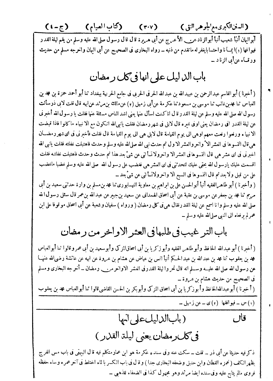قال (باب الدليل على انها في كل رمضان يعني ليلة القدر) ذكر فيه حديثا عن أبي ذر - قلت - سكت عنه وفي سنده عكرمة هو ابن عمار متكلم فيه قال البيهقي في باب مس الفرج