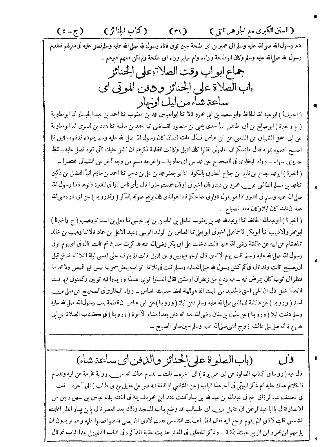 قال (باب الصلوة على الجنائز والدفن اي ساعة شاء) قال فيه (روينا في كتاب الصلوة عن ابي هريرة) إلى آخره - قلت - تقدم هناك انه من رواية مخرمة عن ابيه وتقدم الكلام هناك عليه ثم ذكر البيهقي في آخر هذا الباب (عن الشافعي انا الثقة انه صلى على عقيل بن ابي طالب) إلى آخره - قلت - في مصنف عبد الرزاق اخبرني عبد الله بن عبد الله يسار كنت عند ابن عمر بالمدينة في الفتنة فجاء عباس بن سهل رجل من الانصار فقال يا ابا عبد الرحمن ان عقيل بن ابي طالب قد وضع بباب المسجد وذلك بعد العصر قال يابن يسار انظر اغابت الشمس قلت لا فابى ان يقوم فرجع إليه فقال انظر اغابت الشمس فقلت لا فابى ان يصلى فذهبوا فصلوا عليه وهم يريدون ان يؤمهم ابن عمر وابن الزبير حينئذ بمكة - وذكر الخطابي في المعالم حديث عقبة المذكور في الباب الذي يلي هذا الباب ثم قال