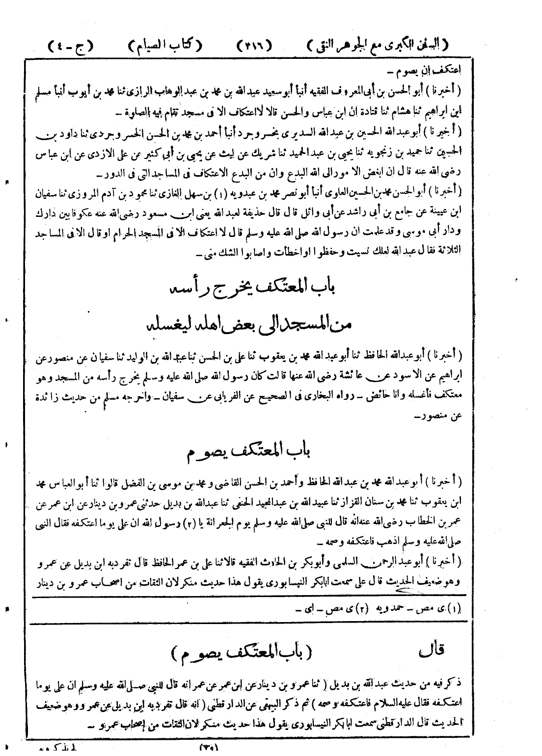 قال (باب المعتكف يصوم) ذكر فيه حديث عبد الله بن بديل (ثنا عمرو بن دينار عن ابن عمر عن عمر انه قال للنبي صلى الله عليه وسلم ان علي يوما اعتكفه فقال عليه السلام فاعتكفه وصمه) ثم ذكر البيهقي عن الدارقطني (انه قال تفرد به ابن بديل عن عمرو وهو ضعيف الحديث قال الدارقطني سمعت ابا بكر النيسابوري يقول هذا حديث منكر لان الثقات من اصحاب عمرو -