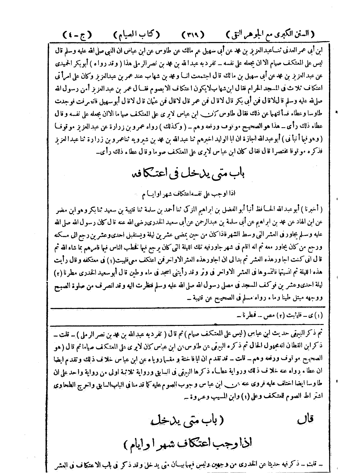 ثم ذكر البيهقي حديث ابن عباس (ليس على المعتكف صيام) ثم قال (تفرد به عبد الله بن محمد بن نصر الرملي) - قلت - ذكر ابن القطان انه مجهول الحال ثم ذكره البيهقي عن طاوس عن ابن عباس كان لا يرى على المعتكف صياما ثم قال (هو الصحيح موقوف ورفعه وهم - قلت - قد تقدم ان ابا فاخته ومقسما روياه عن ابن عباس خلاف وتقدم ايضا ان عطاء رواه عنه خلاف ذلك ورواية عطاء ذكرها البيهقي في السابق ورواية ثلاثة اولى من رواية واحد على ان طاوسا ايضا اختلف عليه فروى عنه عن ابن عباس وجوب الصوم عليه كما قدمنا في الباب السابق واخرج الطحاوي اشتراط الصوم للمعتكف وعلى (1) وابن المسيب وعروة - قال (باب متى يدخل إذا وجب اعتكاف شهرا وايام) - قلت - ذكر فيه حديثا عن الخدري من وجهين وليس فيهما بيان متى يدخل وقد ذكر في باب الاعتكاف في العشر