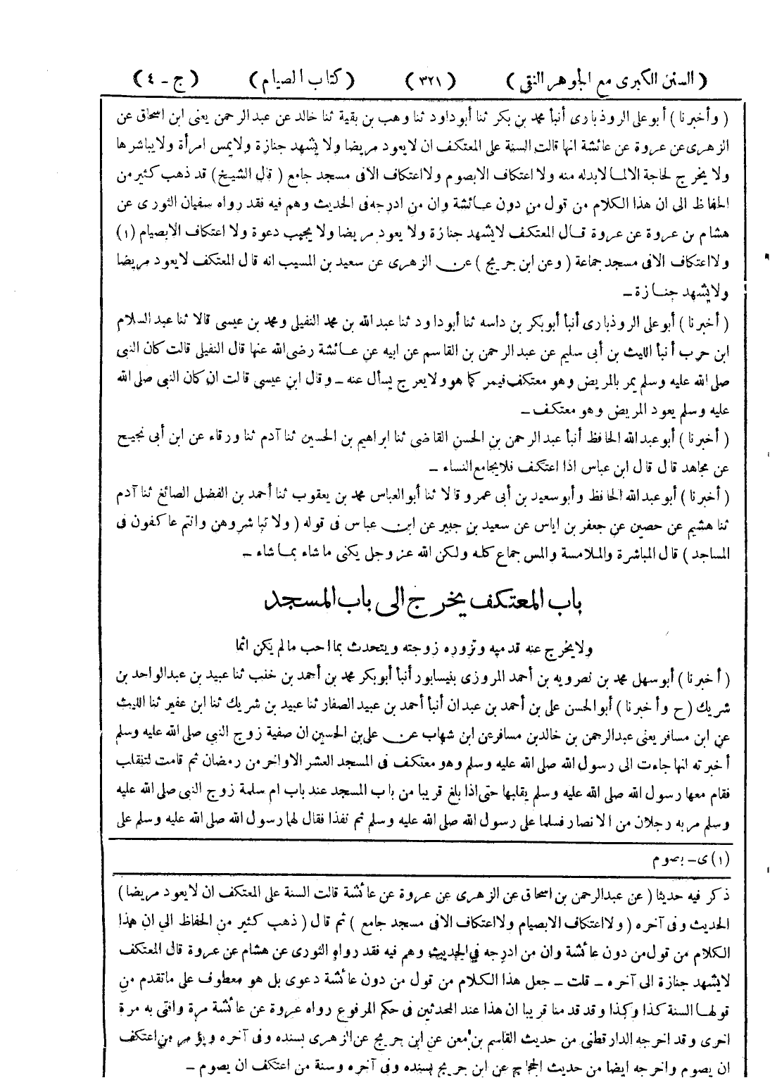 ذكر فيه حديثا (عن عبد الرحمن بن اسحاق عن الزهري عن عروة عن عائشة قالت السنة على المعتكف ان لا يعود مريضا) الحديث وفي آخره (ولا اعتكاف الا بصيام ولا اعتكاف الا في مسجد جامع) ثم قال (ذهب كثير من الحفاظ إلى ان هذا