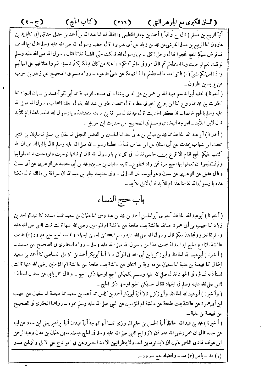 - (أخبرنا) الفقيه أبو القاسم عبيدالله بن عمربن على الفامى ببغداد في مسجد الرصاقة ثنا أبو بكر أحمد بن سلمان النجاد ثنا الحارث بن محمد ثنا روح ثنا ابن جريج اخبرني عطاء قال سمعت جابر بن عبد الله يقول اهللنا اصحاب رسول الله صلى الله عليه وسلم بالحج خالصا - فذكر الحديث قال فيه فقال سراقة بن مالك متعتنا هذه يارسول الله لعامنا هذا ام للابد قال لابل للابد - اخرجه البخاري ومسلم في الصحيح من حديث ابن جريج