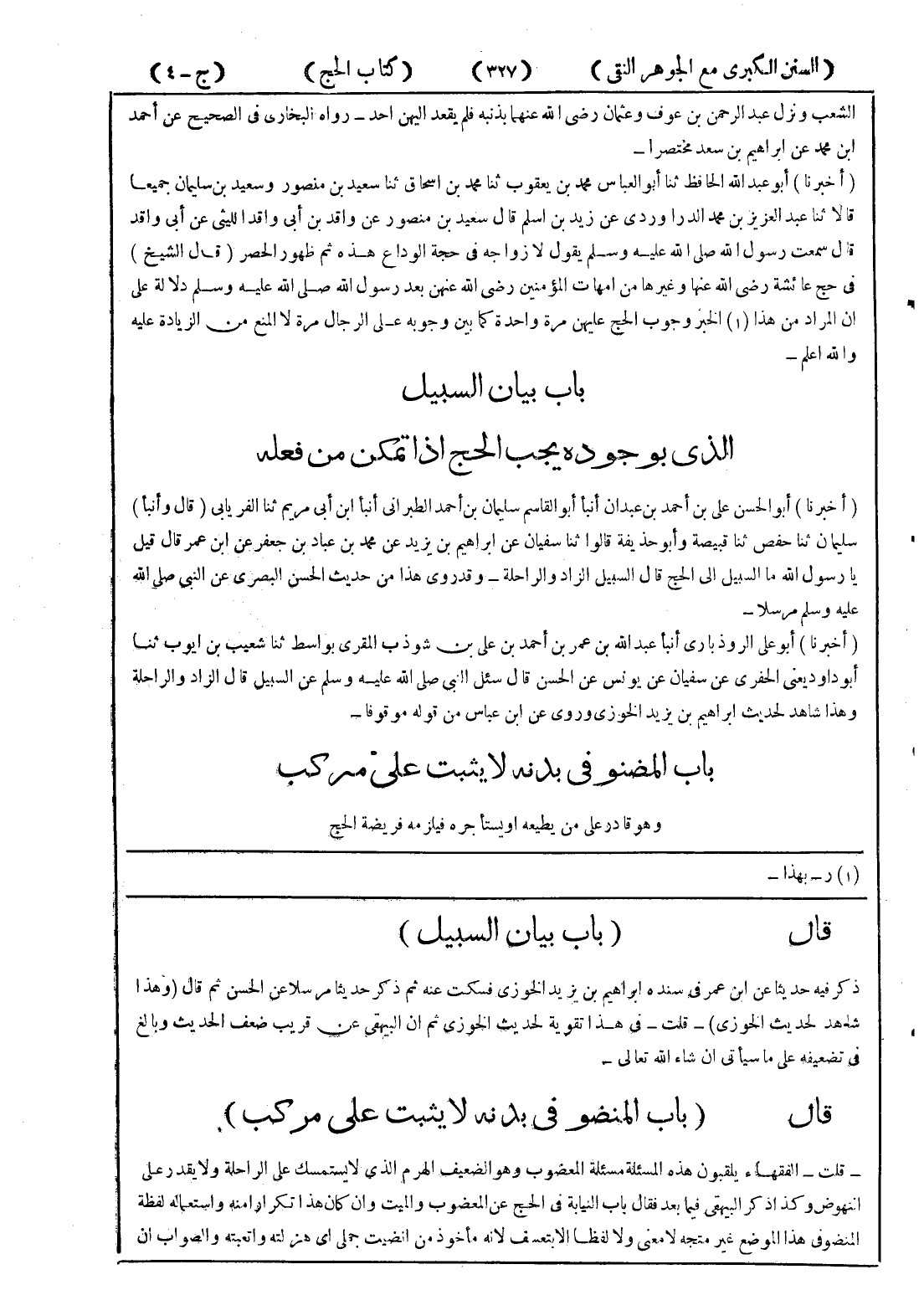قال (باب بيان السبيل) ذكر فيه حديثا عن ابن عمر في سنده ابراهيم بن يزيد الخوزي فسكت عنه ثم ذكر حديثا مرسلا عن الحسن ثم قال (وهذا شاهد لحديث الخوزي) - قلت - في هذا تقوية لحديث الخوزي ثم ان البيهقي عن قريب ضعف الحديث وبالغ في تضعيفه على ما سيأتي ان شاء الله تعالى - قال (باب المنضو في بدنه لا يثبت على مركب) - قلت - الفقهاء يلقبون هذه المسألة مسألة المعضوب وهو الضعيف الهرم الذي لا يستمسك على الراحلة ولا يقدر على النهوض وكذا ذكر البيهقي فيما بعد فقال باب النيابة في الحج عن المعضوب والميت وان كان هذا تكرارا منه واستعماله لفظة المنضو في هذا الموضع غير متجه لا معنى ولا لفظا الا بتعسف لانه مأخوذ من انضيت جملي أي هزلته واتعبته والصواب ان