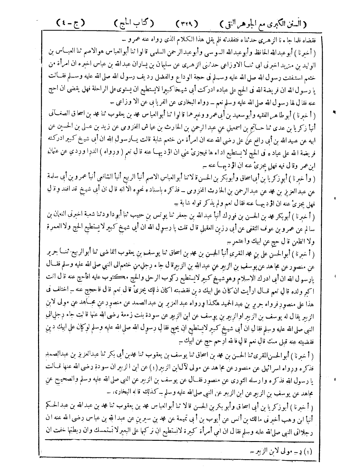- (أخبرنا) أبو عبد الله الحافظ وأبو عبد الله السوسى وأبو عبد الرحمن السلمى قالوا ثنا أبو العباس هو الاصم ثنا العباس بن الوليد بن مزيد اخبرني ابى ثنا الاوزاعي حدثنى الزهري عن سليمان بن يساران عبد الله بن عباس اخبره ان امرأة من خثعم استفتت رسول الله صلى الله عليه وسلم في حجة الوداع والفضل رديف رسول الله صلى الله عليه وسلم فقالت يارسول الله ان فريضة الله في الحج على عباده ادركت أبى شيخا كبيرا لا يستطيع ان يستوى على الراحلة فهل يقضى ان احج عنه فقال لها رسول الله صلى الله عليه وسلم نعم - رواه البخاري عن الفريابى عن الاوزاعي