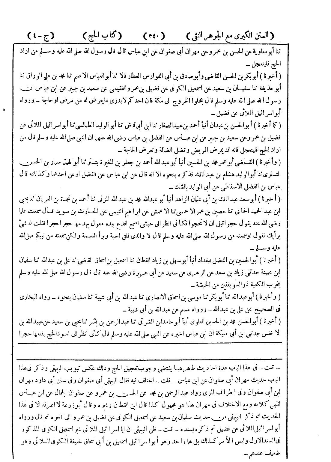 - قلت - في هذا الباب عدة احاديث ظاهرها يقتضي وجوب تعجيل الحج وذلك عكس تبويب البيهقي وذكر في هذا الباب حديث مهران أبي صفوان عن ابن عباس - قلت - اختلف فيه فقال البيهقي أبي صفوان وفي سنن أبي داود مهران ابن أبي صفوان وفي اطراف المزي رواه عبد الرحمن بن محمد عن الحسن بن عمرو عن صفوان الجمال عن ابن عباس انتهى كلامه ومع اختلاف في مهران هذا هو مجهول كذا قال ابن القطان وغيره وقال أبو زرعة لا اعرفه الا في هذا الحديث ثم ذكر البيهقي من حديث سفيان بن سعيد عن اسمعيل الكوفي عن فضيل بن عمرو إلى آخره ثم قال ورواه أبو اسرائيل الملائي عن فضيل ثم ذكره بسنده - قلت - ظن البيهقي ان ابا اسرائيل الملائي غير اسمعيل الكوفي المذكور في السند الاول وليس الامر كذلك بل هما واحد وهو أبو اسرائيل اسمعيل بن أبي اسحاق الكوفي الملائي وهو