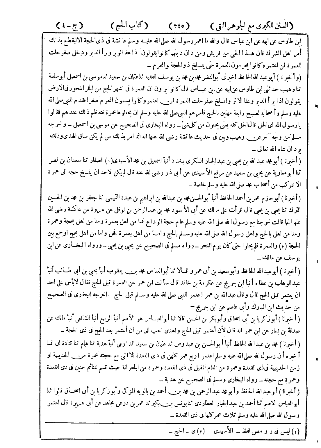 - (أخبرنا) أبو عبد الله الحافظ اخبرني أبو النضر محمد بن محمد بن يوسف الفقيه ثنا عثمان بن سعيد ثنا موسى بن اسمعيل أبو سلمة ثنا وهيب حدثنى ابن طاوس عن ابيه عن ابن عباس قال كانوا يرون ان العمرة في اشهر الحج من افجر الفجور في الارض يقولون إذا برأ الدبر وعفا الاثرو انسلخ صفرحلت العمرة ان اعتمر وكانوا يسمون المحرم صفرا فقدم النبي صلى الله عليه وسلم وأصحابه لصبح رابعة مهلين بالحج فأمرهم النبي صلى الله عليه وسلم ان يجعلوها عمرة فتعاظم ذلك عندهم فقالوا يارسول الله أي الحل قال الحل كله يعنى يحلون من كل شئ - رواه البخاري في الصحيح عن موسى بن اسمعيل - واخرجه مسلم من وجه آخر عن وهيب وبين في حديث عائشة رضى الله عنها انه انما امر بذلك من لم يكن ساق الهدى وذلك يردان شاء الله تعالى