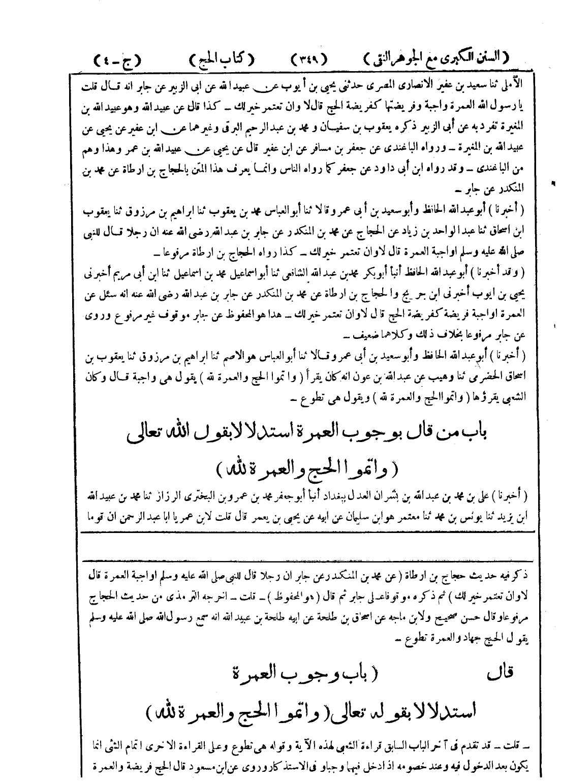 ذكر فيه حديث حجاج بن ارطاة (عن محمد بن المنكدر عن جابر ان رجلا قال للنبي صلى الله عليه وسلم اواجبة العمرة قال لا وان تعتمر خير لك) ثم ذكره موقوفا على جابر ثم قال (هو المحفوظ) - قلت - اخرجه الترمذي من حديث الحجاج مرفوعا وقال حسن صحيح ولابن ماجه عن اسحاق بن طلحة عن ابيه طلحة عن عبيد الله انه سمع رسول الله صلى الله عليه وسلم يقول الحج جهاد والعمرة تطوع - قال (باب وجوب العمرة استدلالا بقوله تعالى (واتموا الحج والعمرة لله) - قلت - قد تقدم في آخر الباب السابق قراءة الشعبي لهذه الآية وقوله هي تطوع وعلى القراءة الاخرى اتمام الشئ انما يكون بعد الدخول فيه وعند خصومه إذا دخل فيهما وجبا وفي الاستذكار وروى عن ابن مسعود قال الحج فريضة والعمرة
