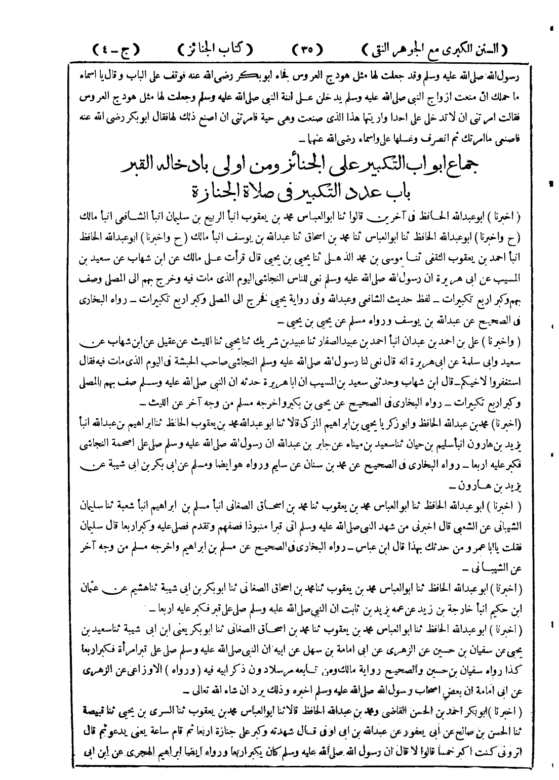 - (أخبرنا) أبو بكر احمد بن الحسن القاضي ومحمد بن عبد الله الحافظ قالا ثنا أبو العباس محمد بن يعقوب ثنا السري بن يحيى ثنا قبيصة ثنا الحسن بن صالح عن ابي يعفور عن عبد الله بن ابي اوفى قال شهدته و كبر على جنازة اربعا ثم قام ساعة يعني يدعو ثم قال اتروني كنت اكبر خمسا قالوا لا قال ان رسول الله صلى الله عليه وسلم كان يكبر اربعا ورواه ايضا ابراهيم الهجري عن ابن ابي