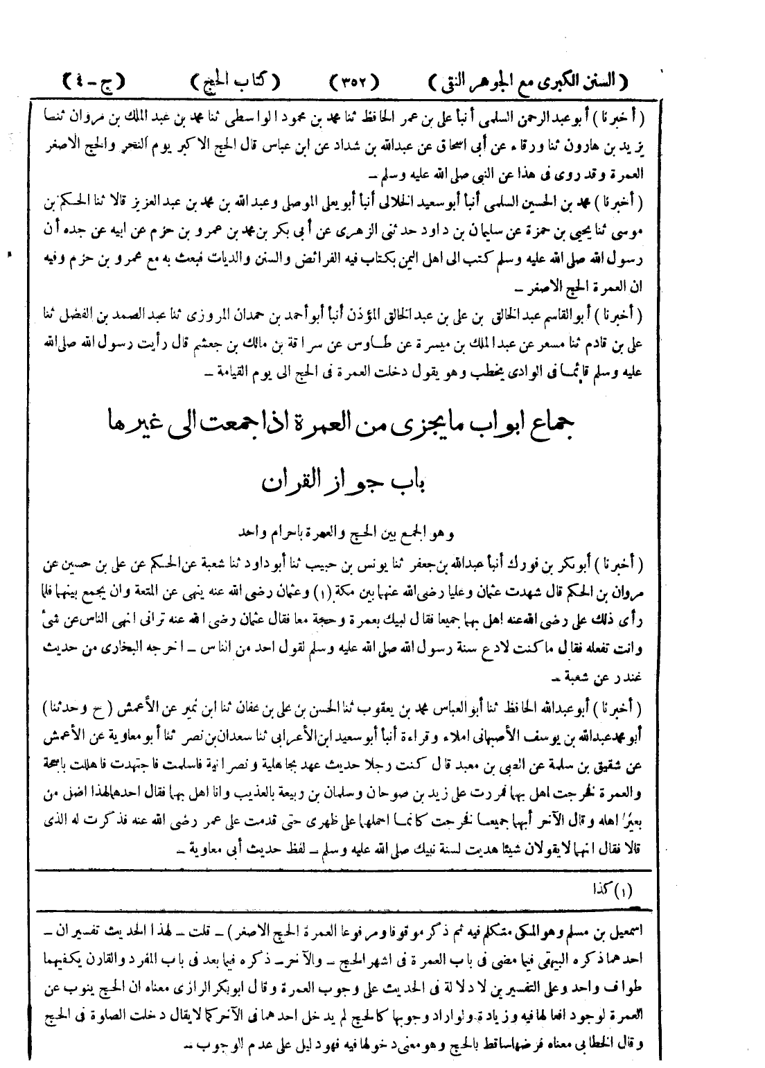 اسمعيل بن مسلم وهو المكي متكلم فيه ثم ذكر موقوفا ومرفوعا العمرة الحج الاصغر) - قلت - لهذا الحديث تفسيران - احدهما ذكر البيهقي فيما مضى في باب العمرة في اشهر الحج - والآخر - ذكره فيما بعد في باب المفرد والقارن يكفيهما طواف واحد وعلى التفسيرين لا دلالة في الحديث على وجوب العمرة وقال أبو بكر الرازي معناه ان الحج ينوب عن العمرة لوجود افعالها فيه وزيادة ولو اراد وجوبها كالحج لم يدخل احدهما في الآخر كما لا يقال دخلت الصلوة في الحج وقال الخطابي معناه فرضها ساقط بالحج وهو معنى دخولها فيه فهو دليل على عدم الوجوب -