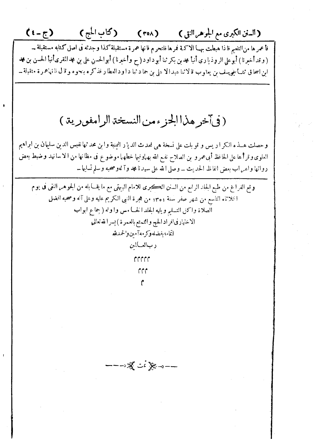(ح وأخبرنا) أبو الحسن على بن محمد المقرى أنبأ الحسن بن محمد ابن اسحاق ثنا يوسف بن يعقوب قالا ثنا عبد الاعلى بن حمادثنا داود العطار فذكره بنحوه وقال فان عمرة متقبلة - (في آخر هذا الجزء من النسخة الرامفورية) وحصلت هذه الكراريس وقوبلت على نسخة هي لمحدث الديار اليمينة وابن محدثها نفيس الدين سليمان بن ابراهيم العلوى وقرأها على الحافظ ابى عمرو بن الصلاح نفع الله بهما وفيها خطهما موضوع في مظانها من الاسانيد وضبط بعض رواتها واعراب بعض الفاظ الحديث - وصلى الله على سيدنا محمد وآله وصحبه وسلم تسليما - وقع الفراغ من طبع الجلد الرابع من السنن الكبرى للامام البيهقي مع ما يقابله من الجوهر النقي في يوم الثلاثاء التاسع من شهر صفر سنة 1351 من هجرة النبي الكريم عليه وعلى آله وصحبه افضل الصلاة واكمل التسليم ويليه الجلد الخامس واوله (جماع أبواب الاختيار في افراد الحج والتمتع بالعمرة) يسر الله تعالى اتمامه بفضله وكرمه آمين والحمد لله رب العالمين - * (تمت) * -