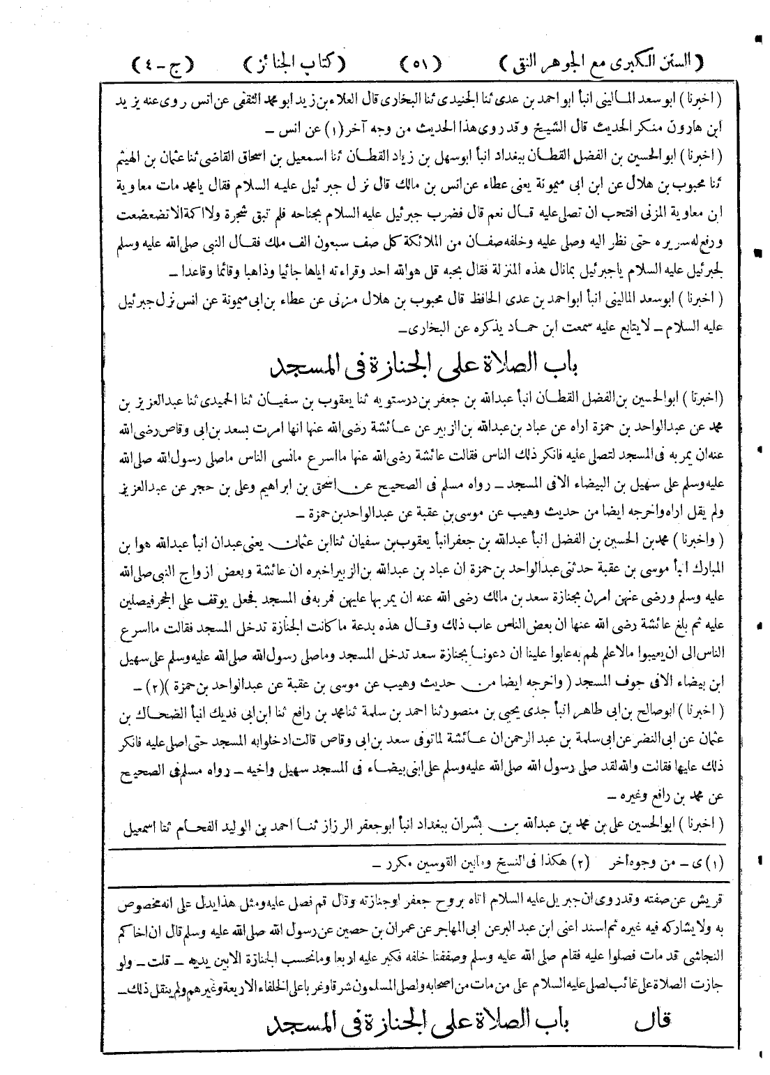 قريش عن صفته وقد روى ان جبرئيل عليه السلام اتاه بروح جعفر أو جنازته وقال قم فصل عليه ومثل هذا يدل على انه مخصوص به ولا يشاركه فيه غيره ثم اسند اعني ابن عبد البر عن ابي المهاجر عن عمران بن حصين عن رسول الله صلى الله عليه وسلم قال ان اخاكم النجاشي قد مات فصلوا عليه فقام صلى الله عليه وسلم وصففنا خلفه فكبر عليه اربعا وما نحسب الجنازة الا بين يديه - قلت - ولو جازت الصلاة على غائب لصلى عليه السلام على من مات من اصحابه ولصلى المسلمون شرقا وغربا على الخلفاء الابعة وغيرهم ولم ينقل ذلك - قال باب الصلاة على الجنازة في المسجد