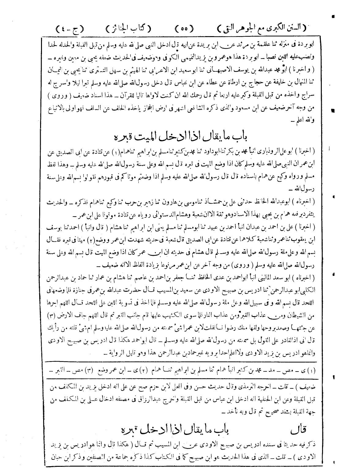 ضعيف) - قلت - اخرجه الترمذي وقال حديث حسن وفي المحلي لابن حزم صح عن علي انه ادخل يزيد بن المكفف من قبل القبلة وعن ابن الحنفية انه ادخل ابن عباس من قبل القبلة واخرج عبد الرزاق في مصنفه ادخال علي بن المكفف من جهة القبلة بسند صحيح ثم قال وبه نأخذ - قال باب ما يقال إذا ادخل قبره ذكر فيه حديثا في سنده ادريس بن صبيح الاودي عن ابن المسيب ثم قال (هكذا قال وانما هو ادريس بن يزيد الاودي) - قلت - الذي في هذا الحديث هو ابن صبيح كما في الكتاب كذا ذكره جماعة من المصنفين وذكر ابن حبان